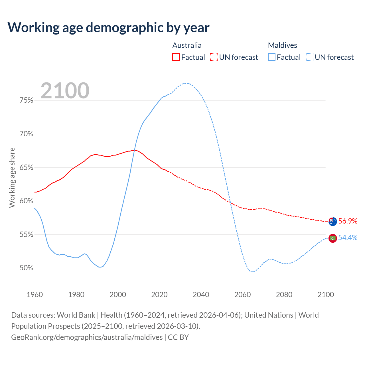 - Australia has 17.9M working age adults (aged 15-64) vs 403K in Maldives.