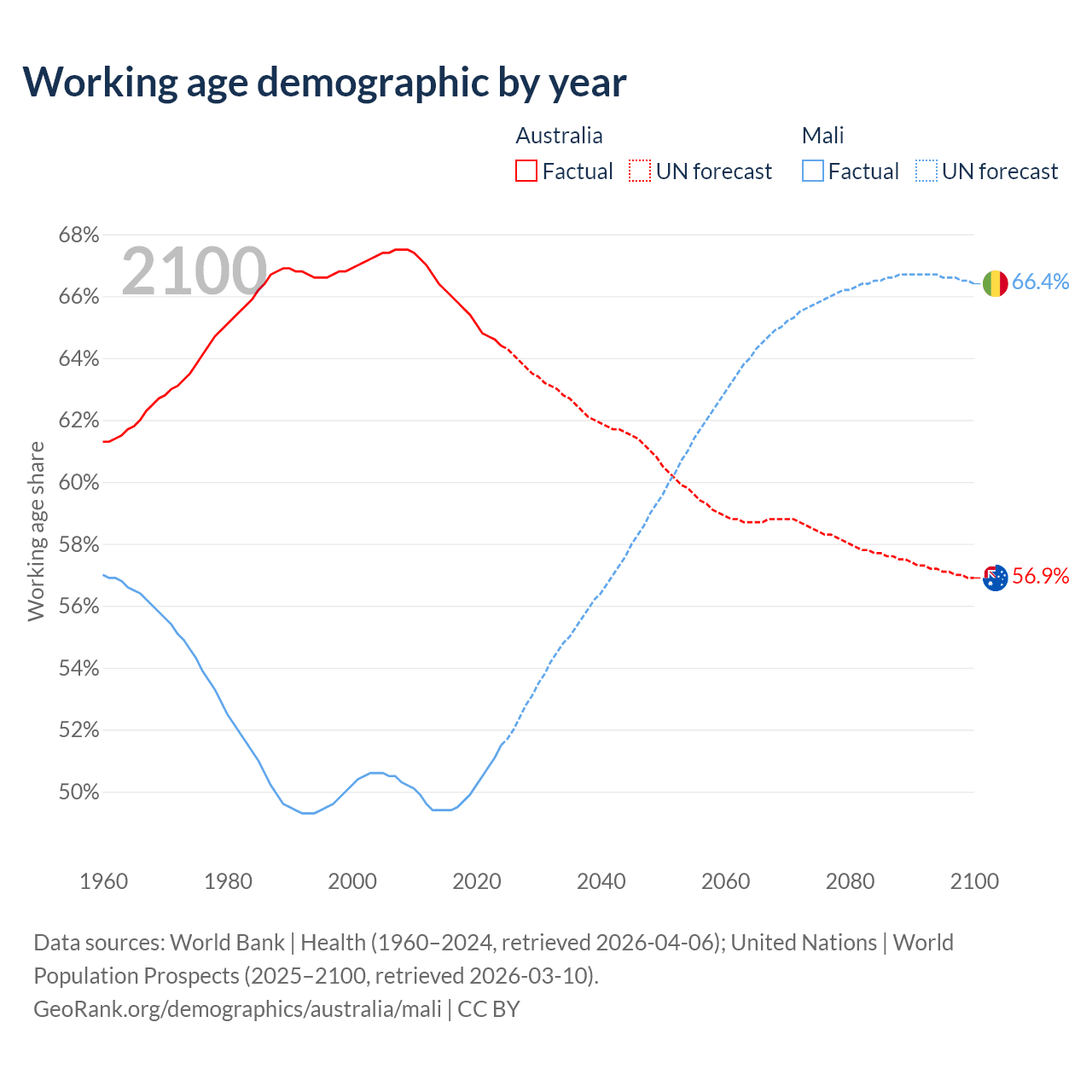 - Australia has 17.9M working age adults (aged 15-64) vs 13.5M in Mali.
