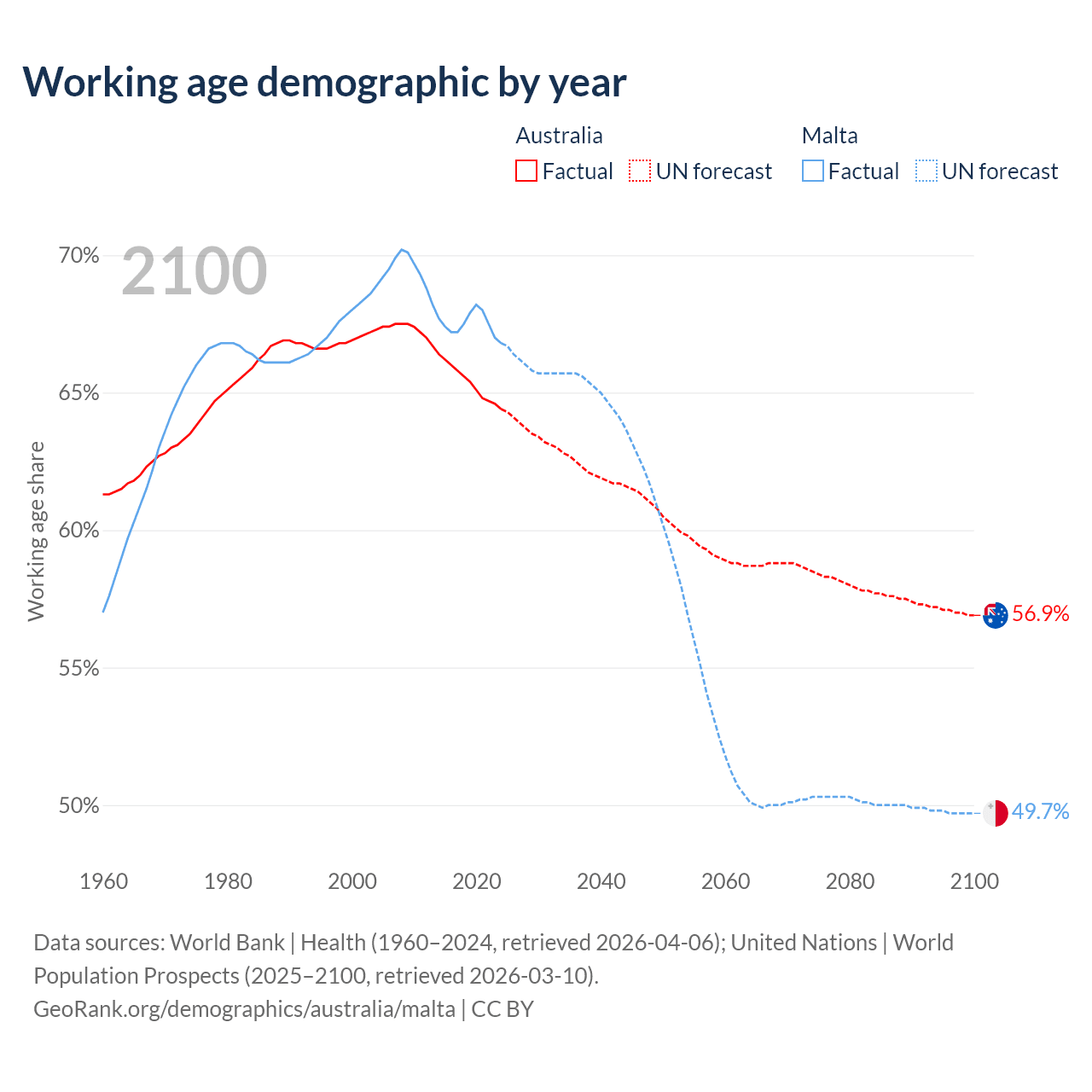 - Australia has 17.9M working age adults (aged 15-64) vs 388K in Malta.