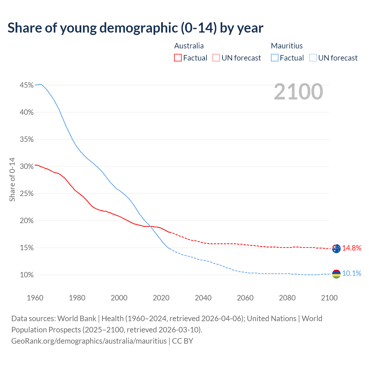 - The share of young demographic (0-15 years old) in Australia is 17.8% vs 14.8% in Mauritius.