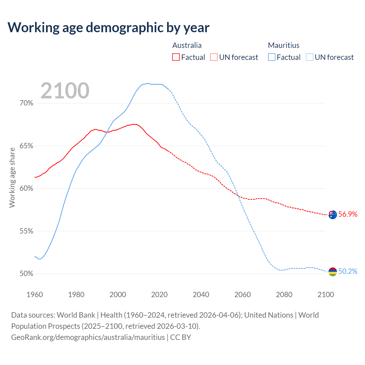 - Australia has 17.9M working age adults (aged 15-64) vs 889K in Mauritius.