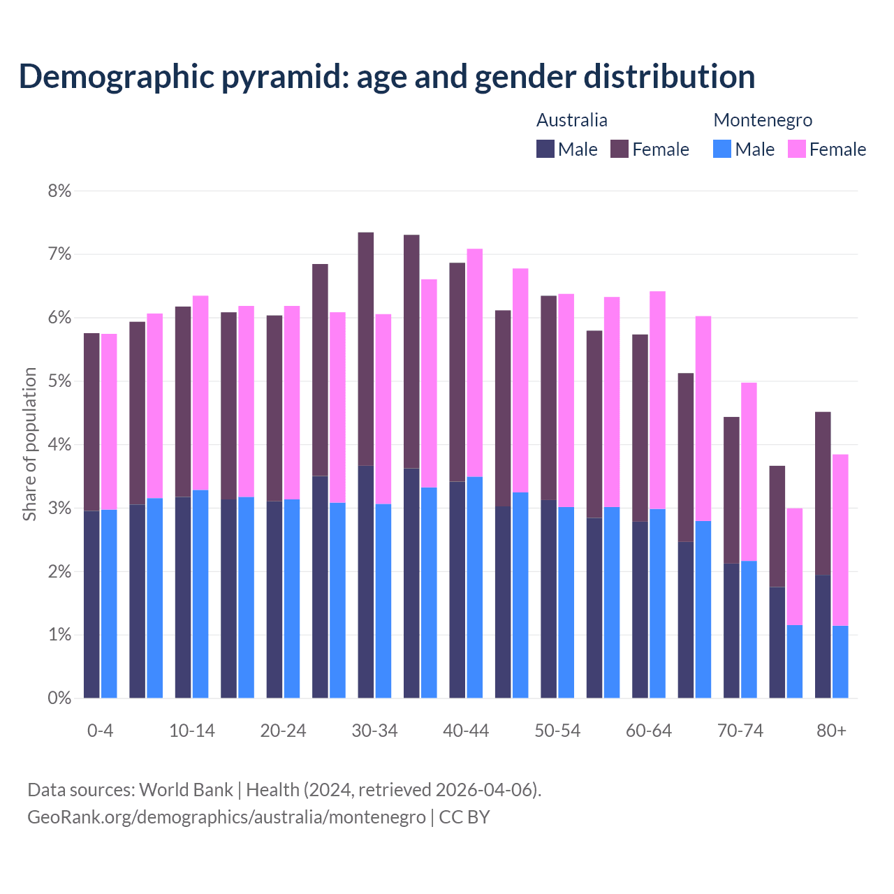 - The share of old-age demographic (65+) in Australia is 17.7% vs 17.8% in Montenegro.
