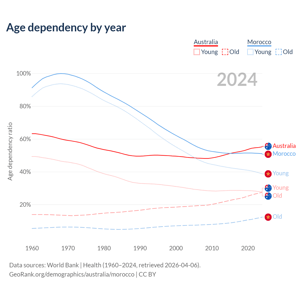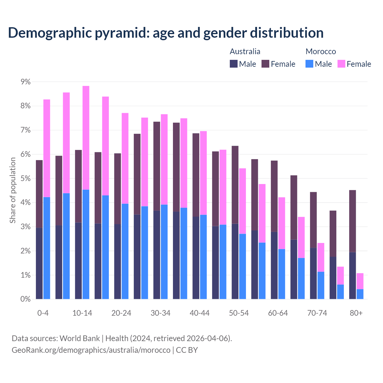 - Australia is ranked 55/196 by median age (oldest to youngest) vs 100/196 for Morocco.