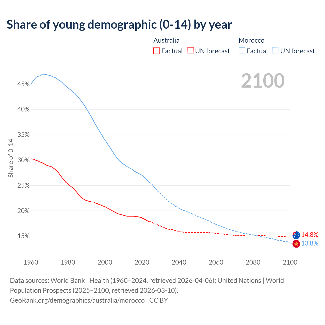 - The share of young demographic (0-15 years old) in Australia is 17.8% vs 25.6% in Morocco.