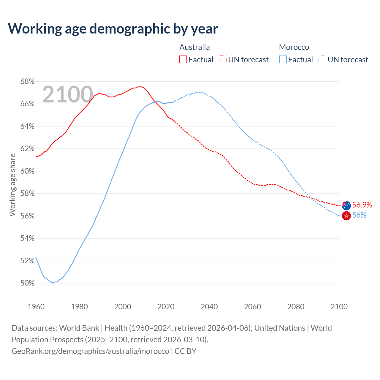 - Australia has 17.9M working age adults (aged 15-64) vs 25.7M in Morocco.
