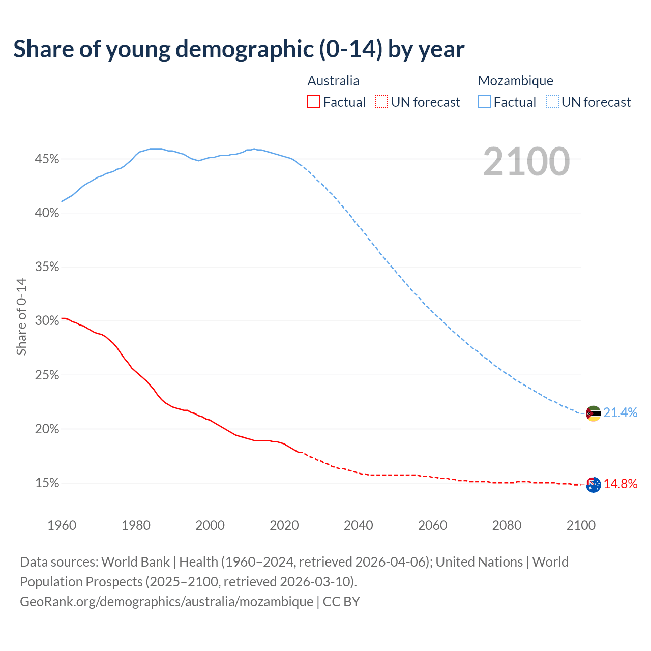 - The share of young demographic (0-15 years old) in Australia is 17.8% vs 44.5% in Mozambique.