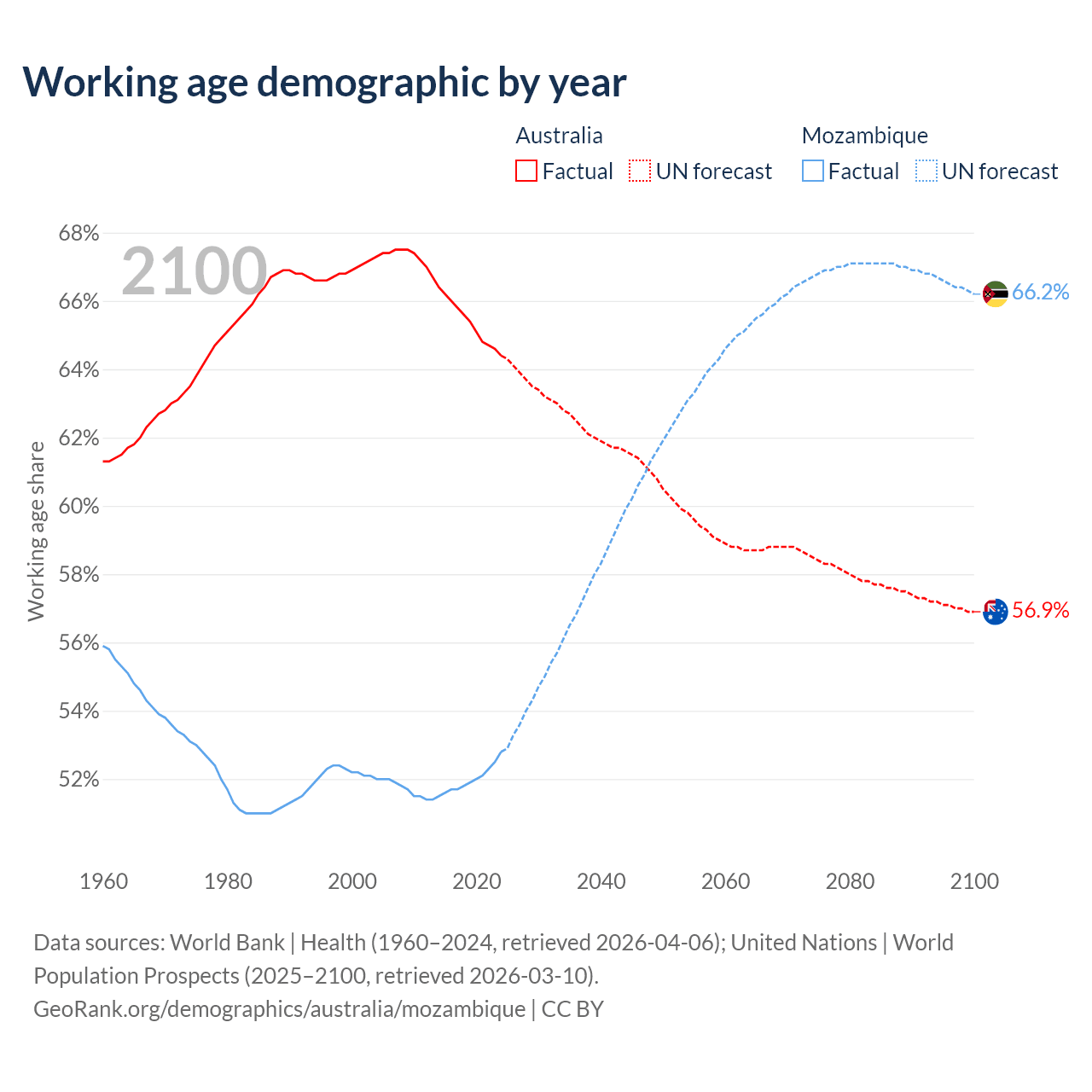 - Australia has 17.9M working age adults (aged 15-64) vs 19.5M in Mozambique.