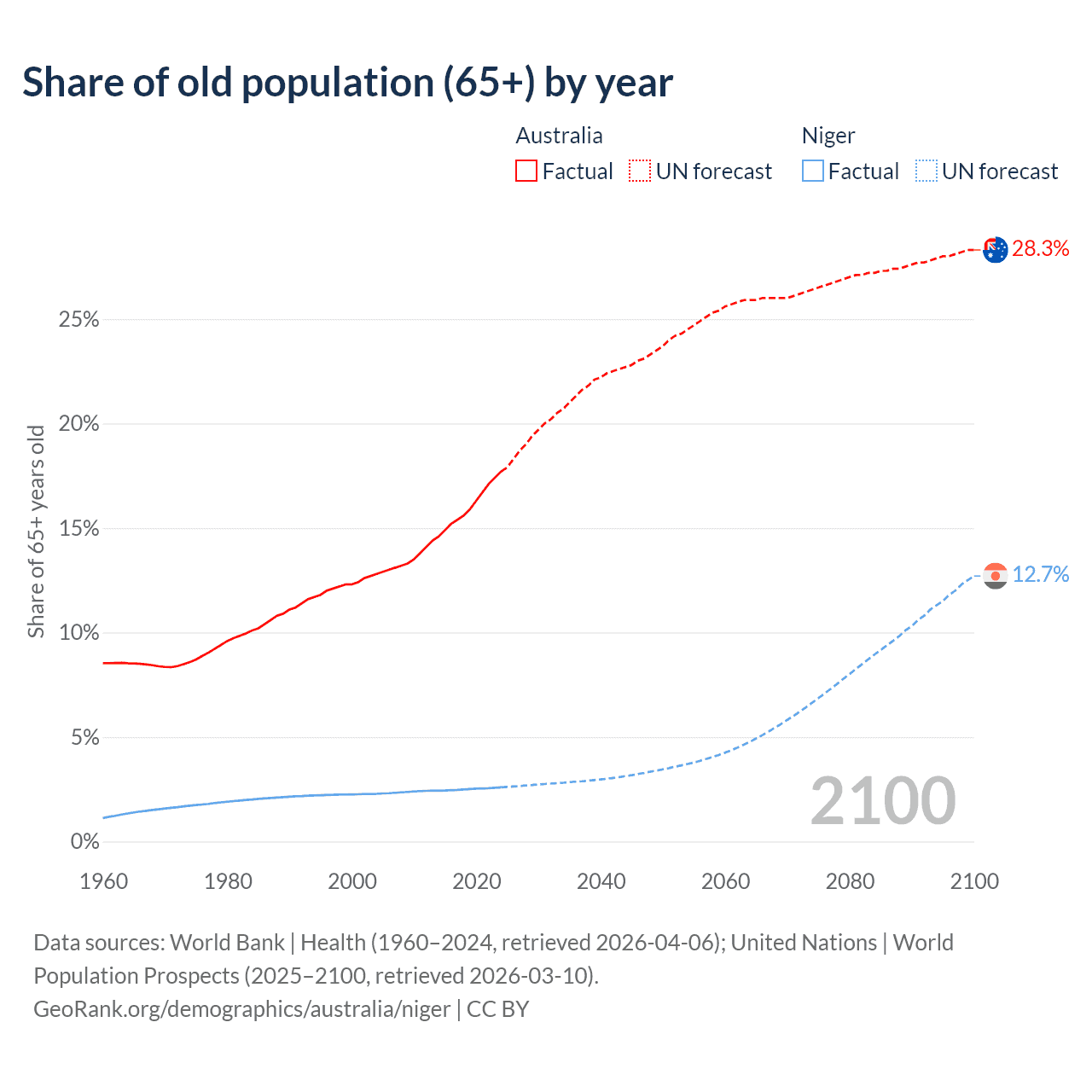 The share of older people aged 65 and over is 17.7% in Australia and 2.59% in Niger. Life expectancy in Australia compared to Niger .