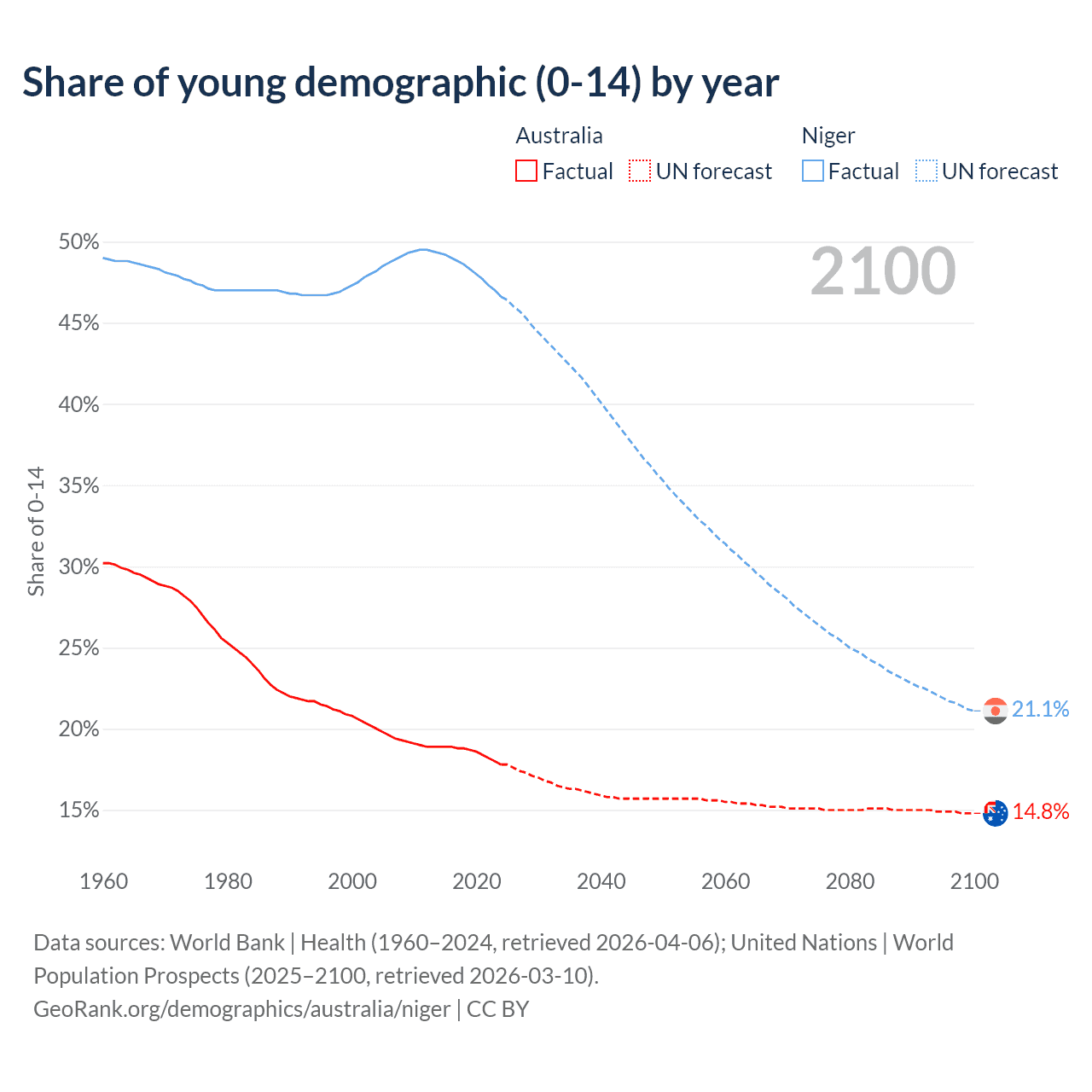 - The share of young demographic (0-15 years old) in Australia is 17.8% vs 46.6% in Niger.