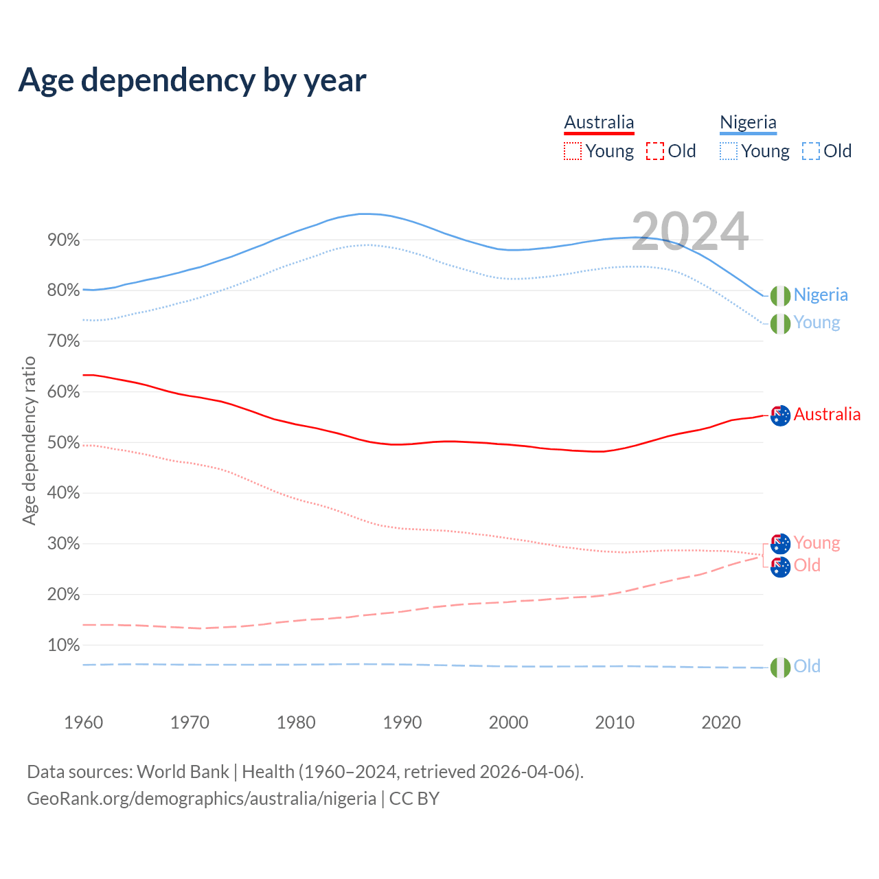 - Australia is ranked 55/196 by median age (oldest to youngest) vs 178/196 for Nigeria.