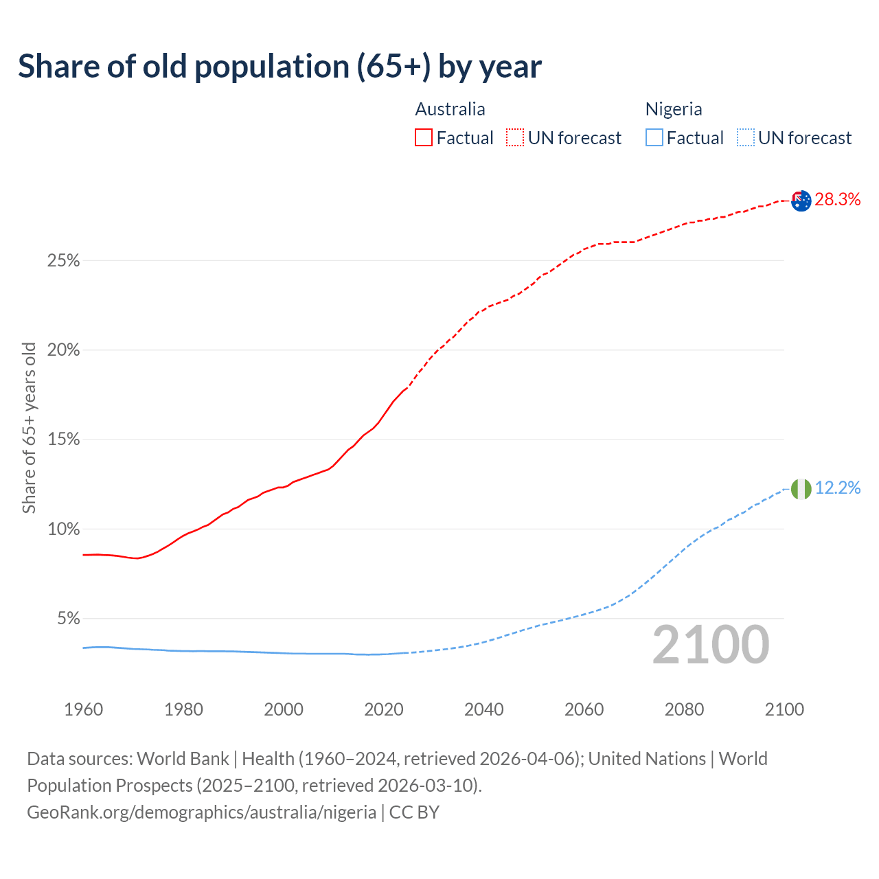 The share of older people aged 65 and over is 17.7% in Australia and 3.05% in Nigeria. Life expectancy in Australia compared to Nigeria .