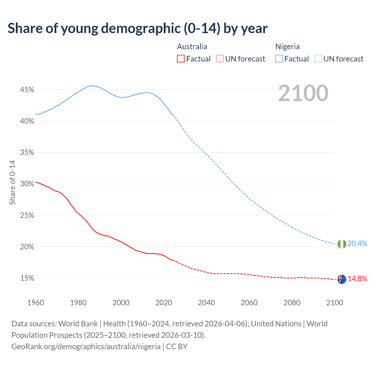 - The share of young demographic (0-15 years old) in Australia is 17.8% vs 41% in Nigeria.