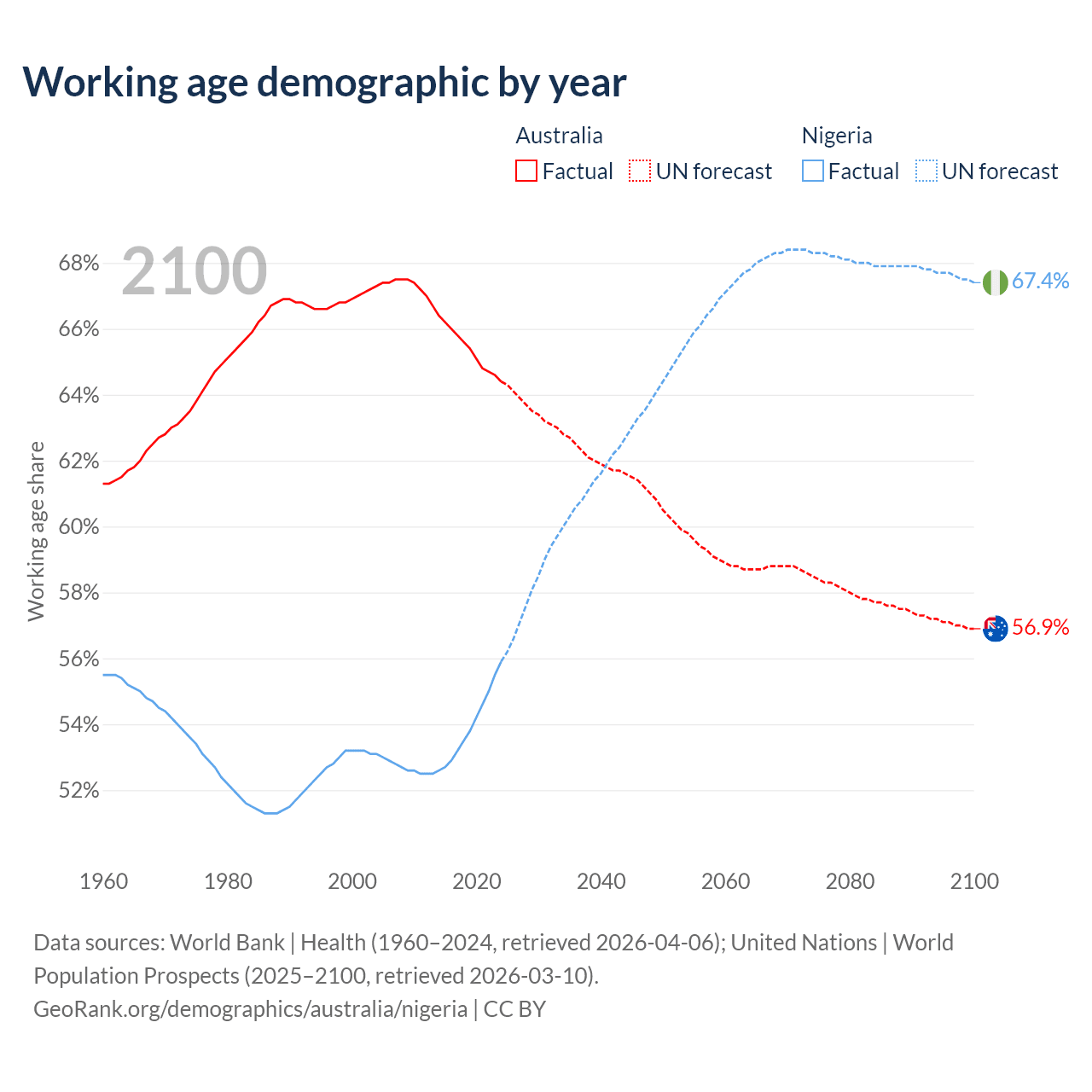 - Australia has 17.9M working age adults (aged 15-64) vs 136M in Nigeria.