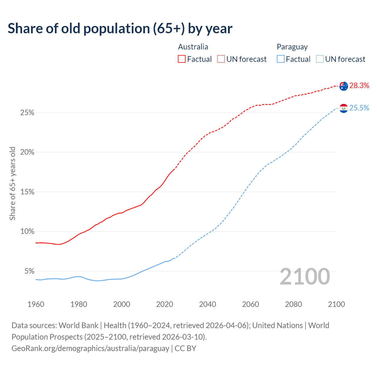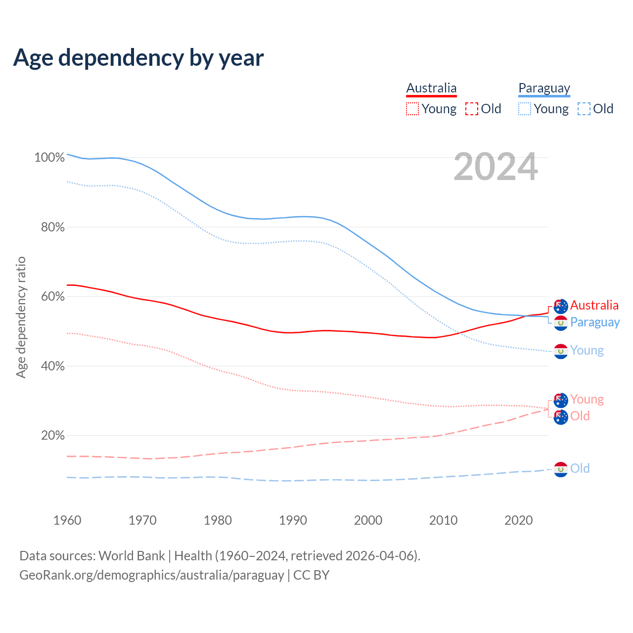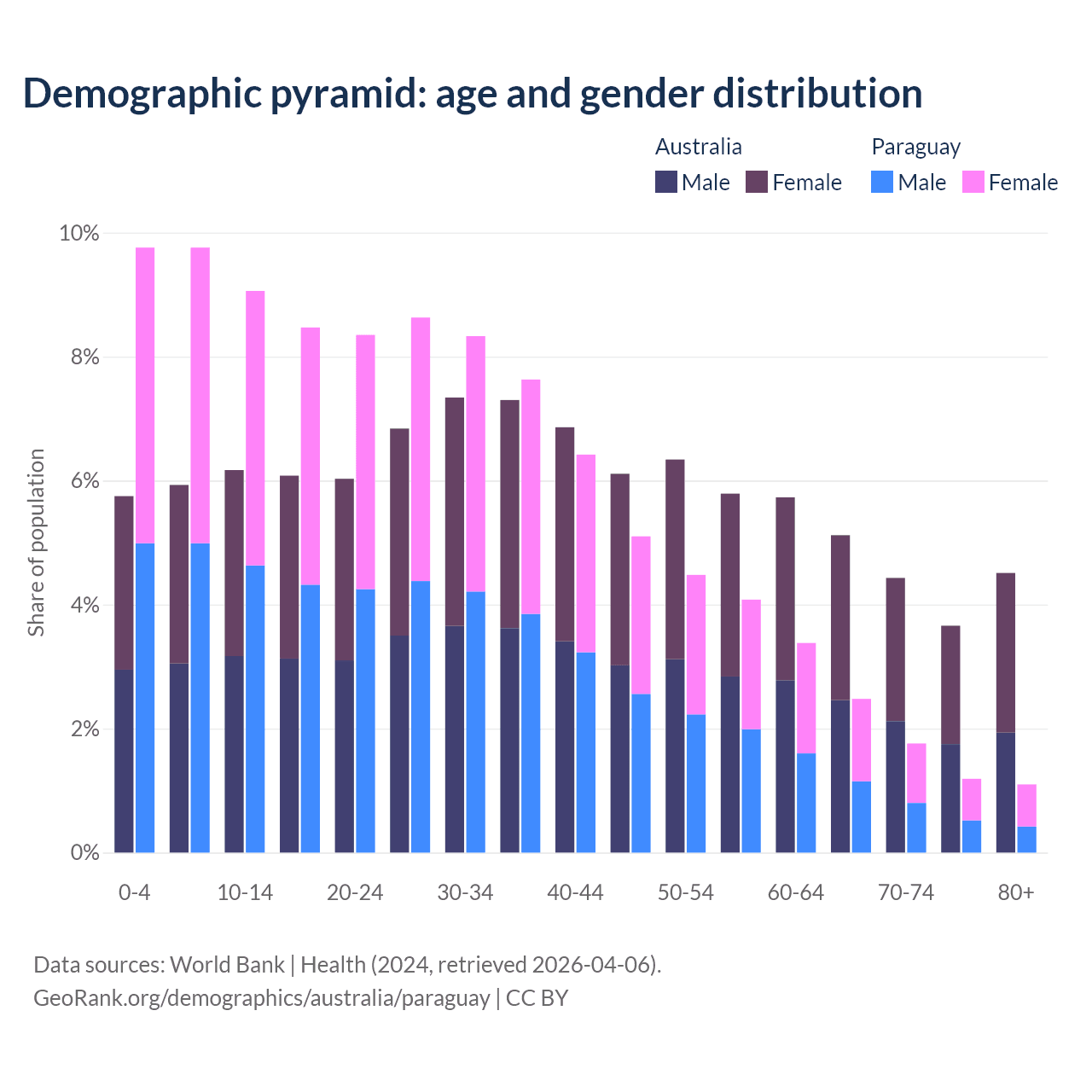 - The share of old-age demographic (65+) in Australia is 17.7% vs 6.54% in Paraguay.