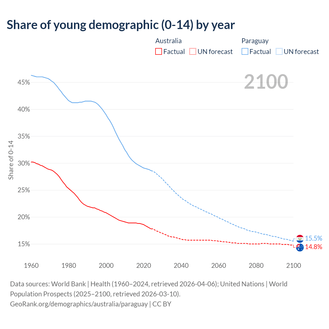 - The share of young demographic (0-15 years old) in Australia is 17.8% vs 28.6% in Paraguay.