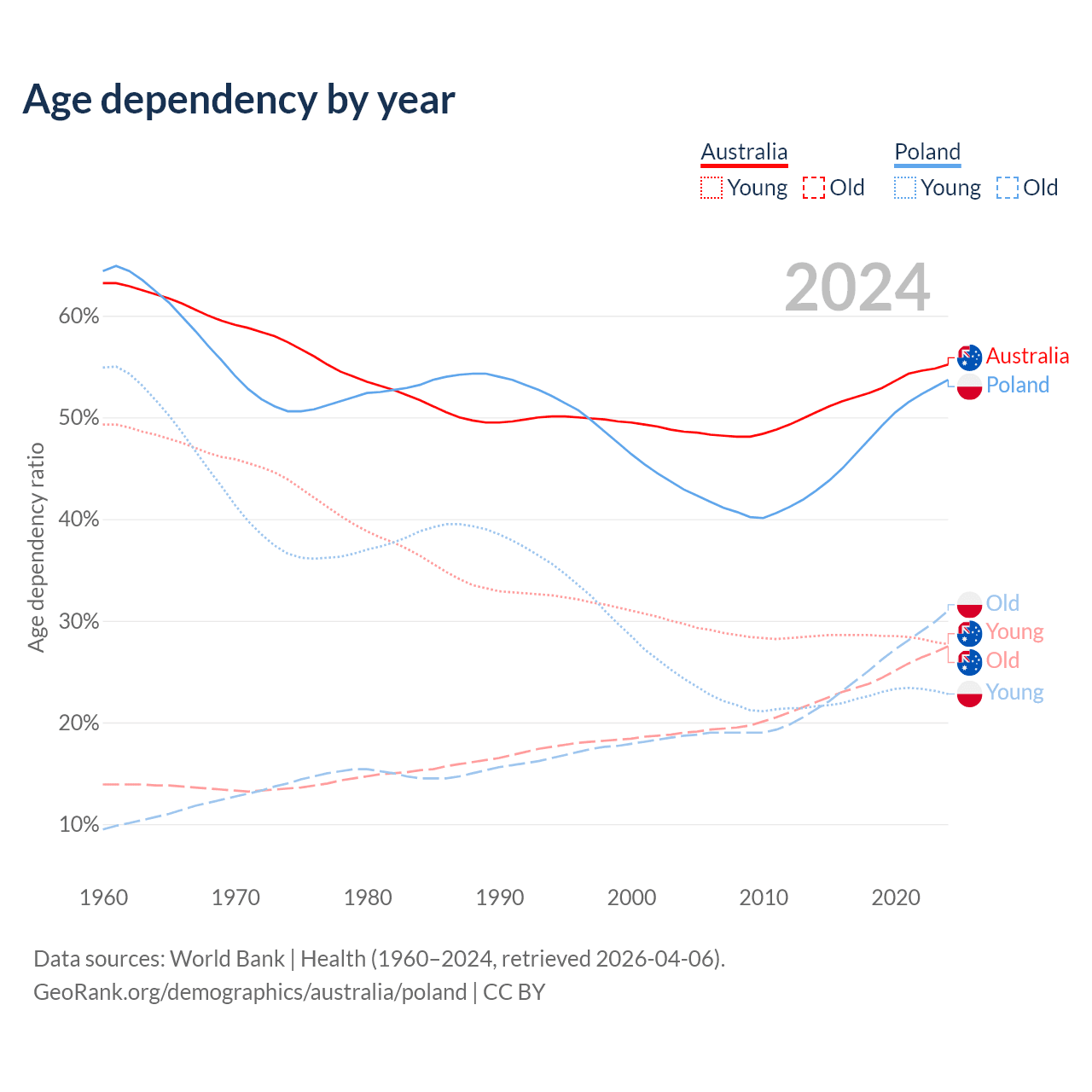 - Australia is ranked 55/196 by median age (oldest to youngest) vs 30/196 for Poland.