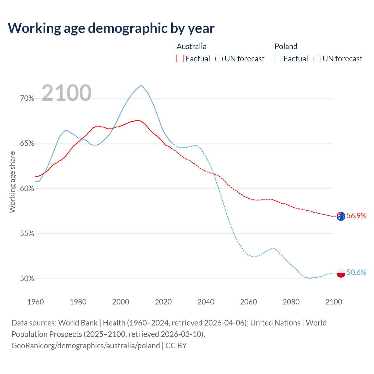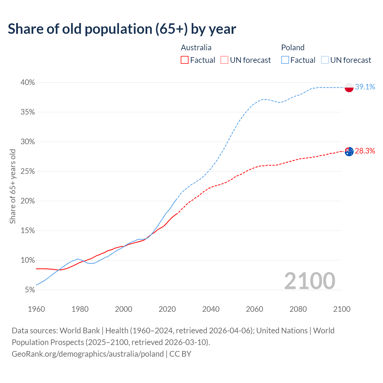 Median age Australia vs Poland, 1960-2100