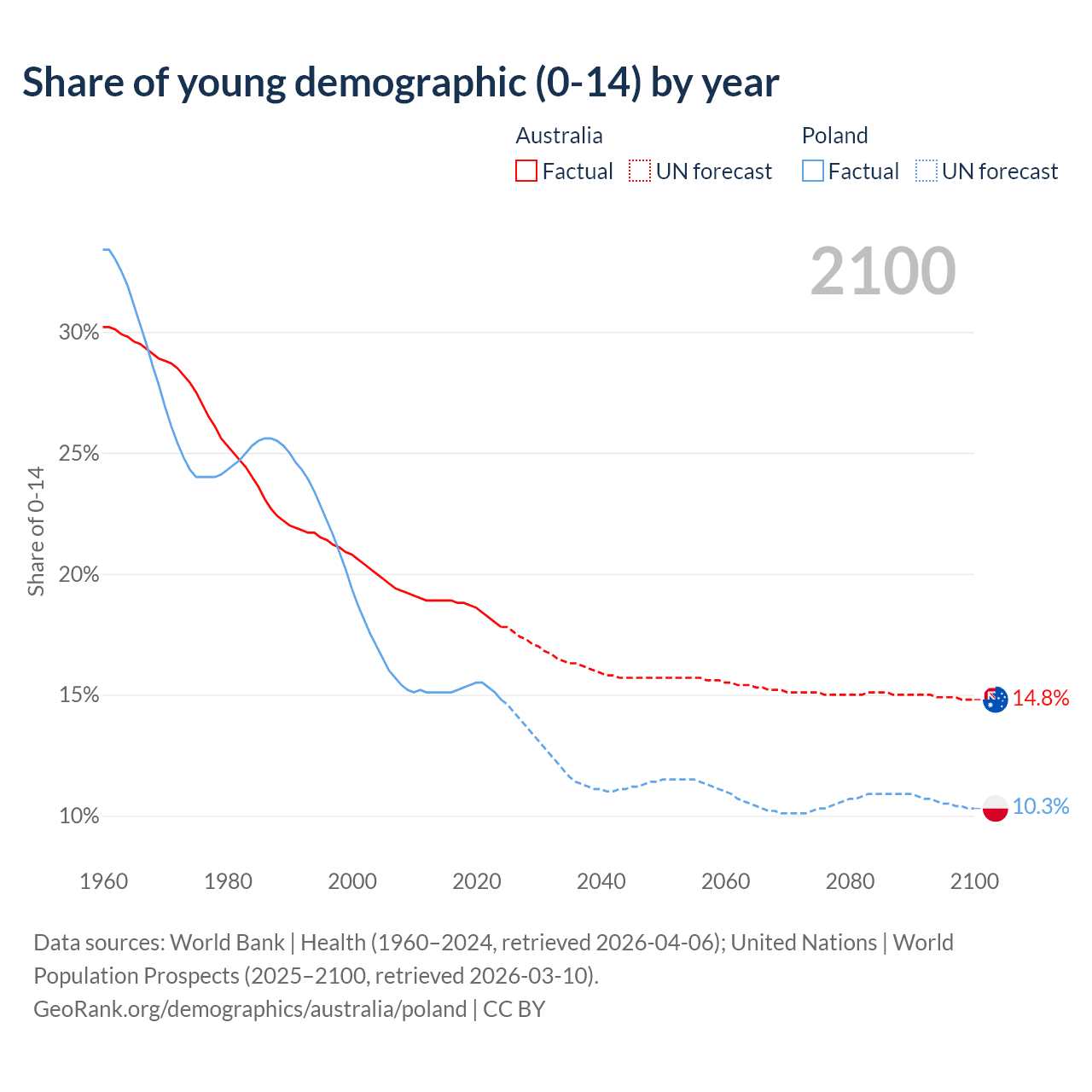 - The share of young demographic (0-15 years old) in Australia is 17.8% vs 14.8% in Poland.