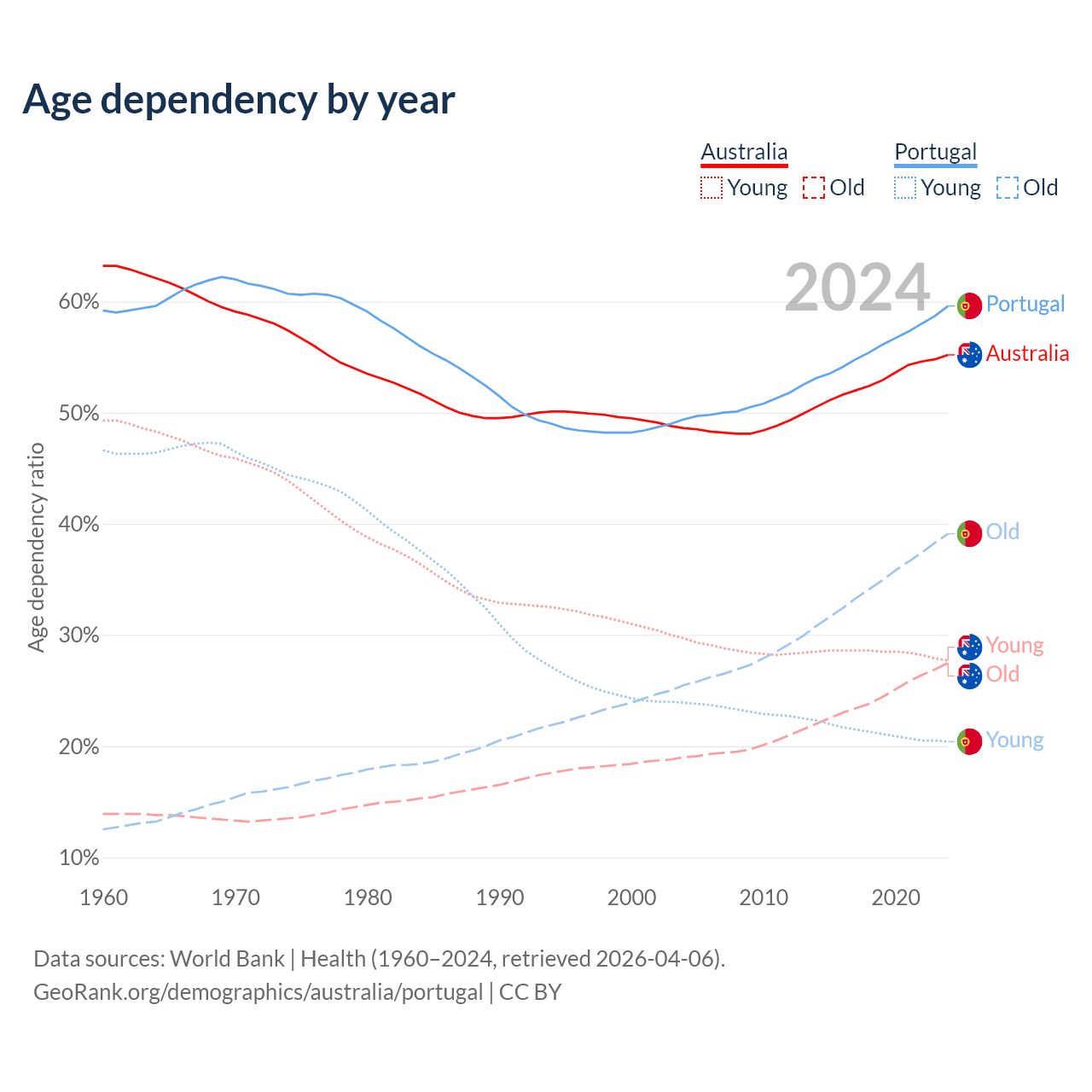 - Australia is ranked 55/196 by median age (oldest to youngest) vs 5/196 for Portugal.