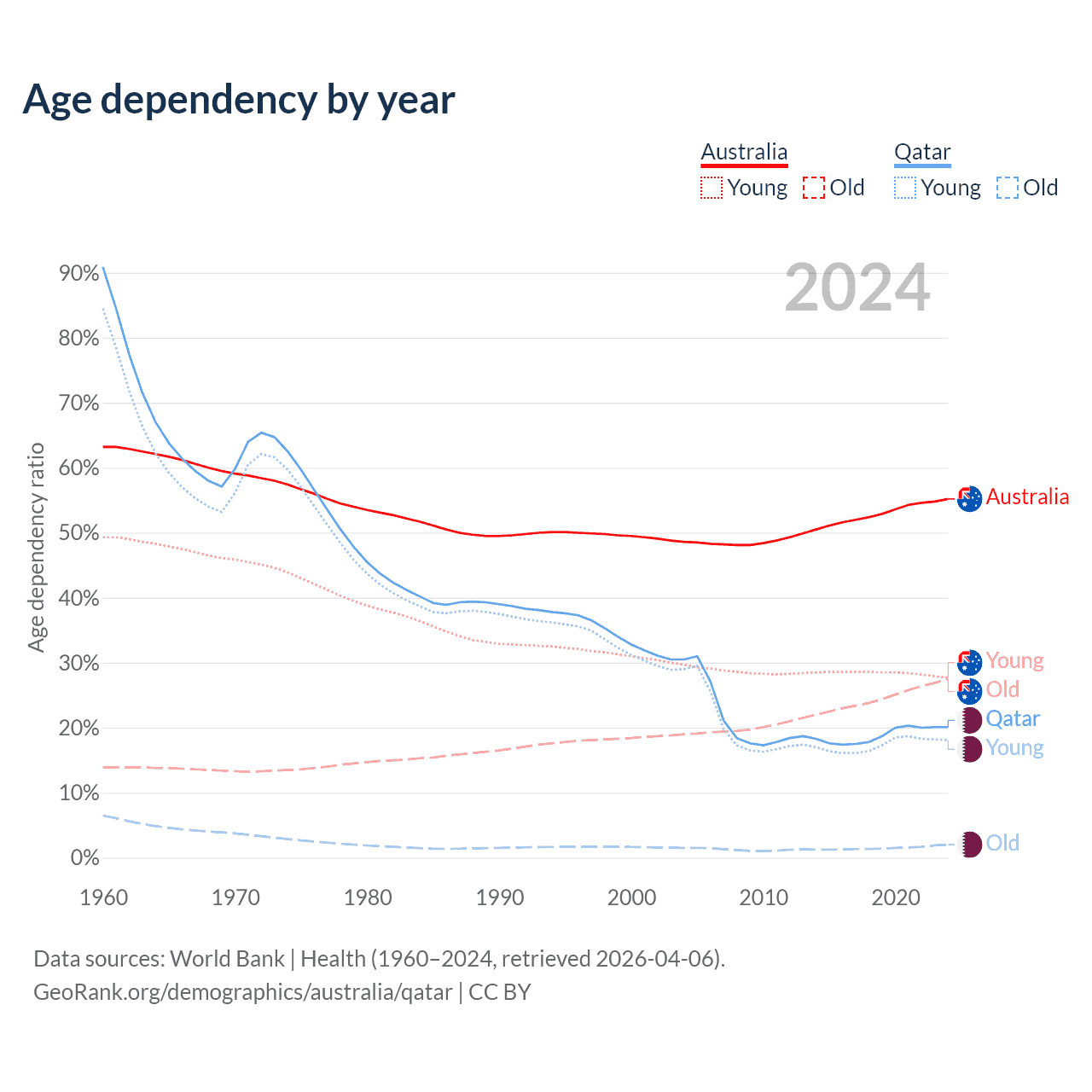 Data sources: World Bank | Health (1960–2024, retrieved 2026-04-06); U.S. Census Bureau (1960–2024, retrieved 2026-02-08).