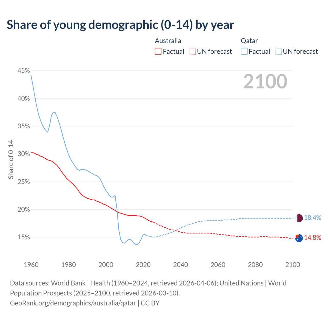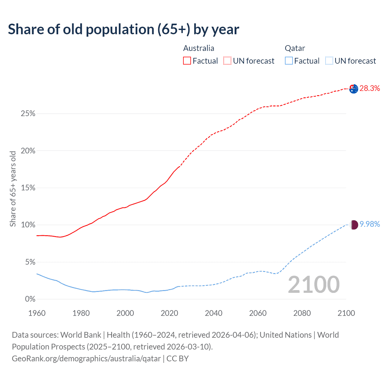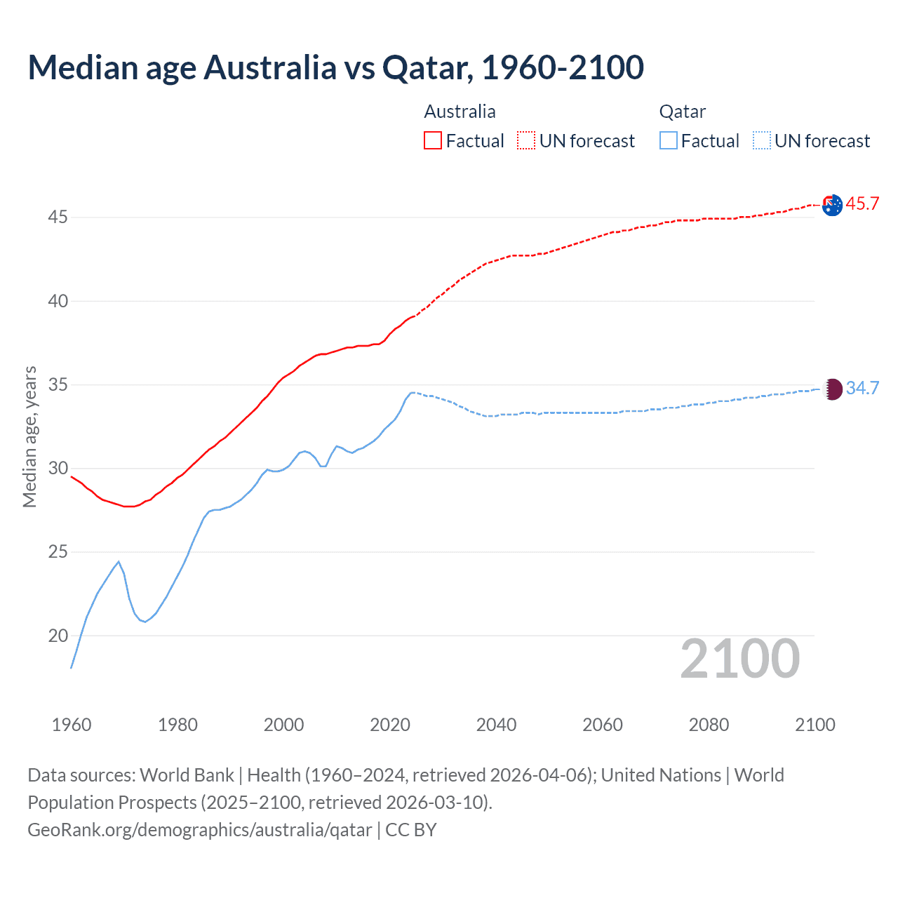 Median age Australia vs Qatar, 1960-2100