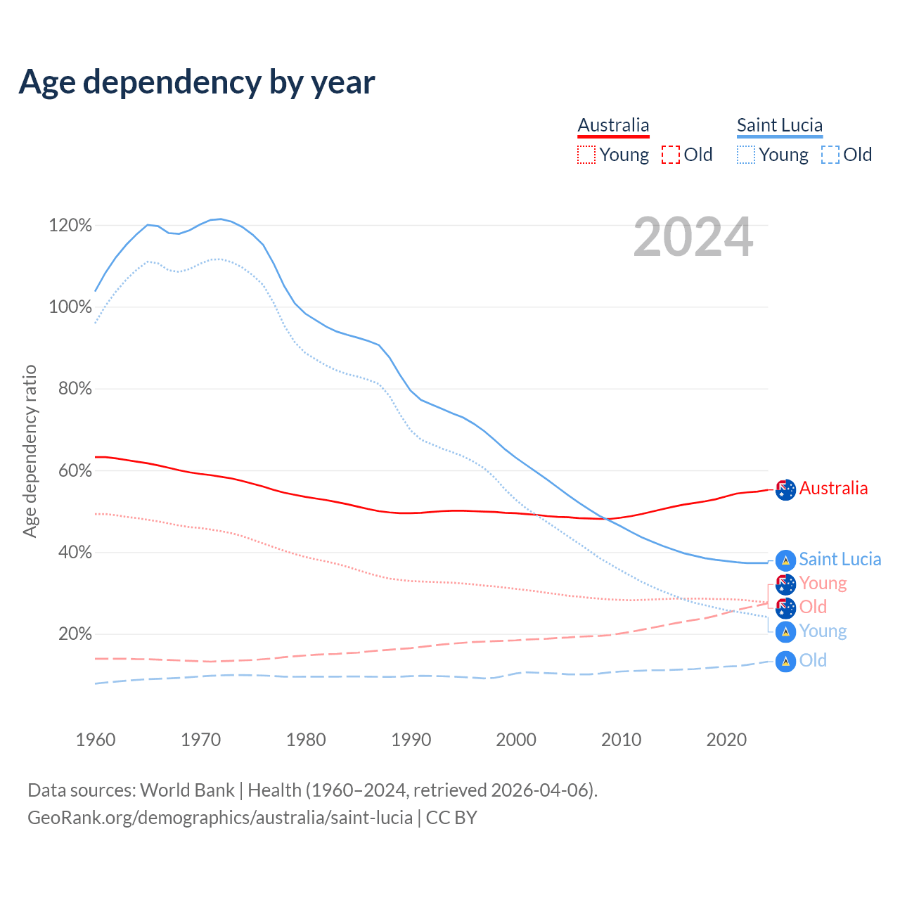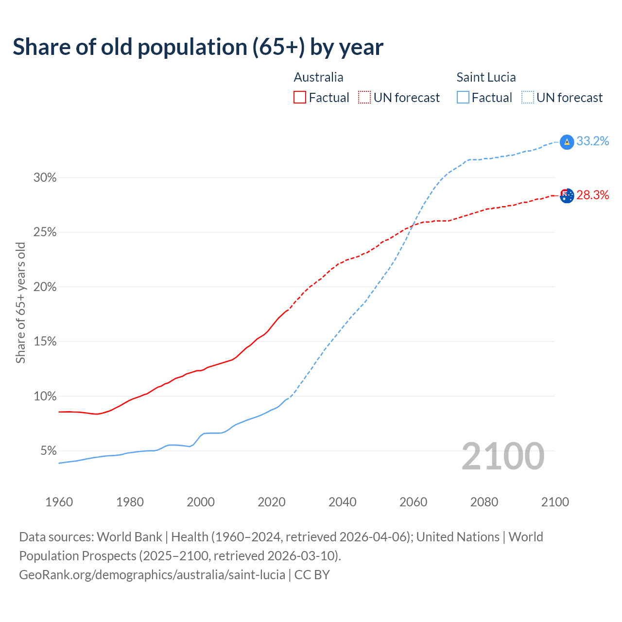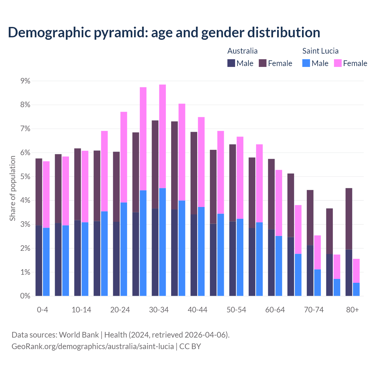 - The share of old-age demographic (65+) in Australia is 17.7% vs 9.62% in Saint Lucia.
