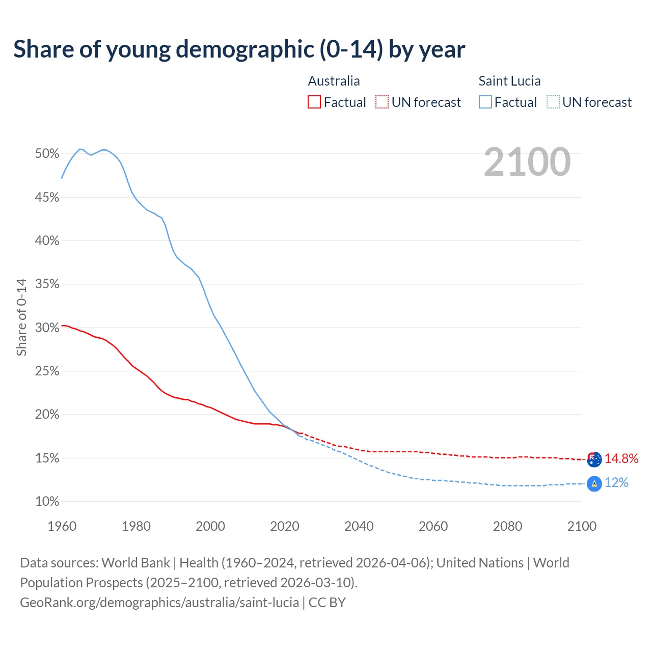- The share of young demographic (0-15 years old) in Australia is 17.8% vs 17.5% in Saint Lucia.