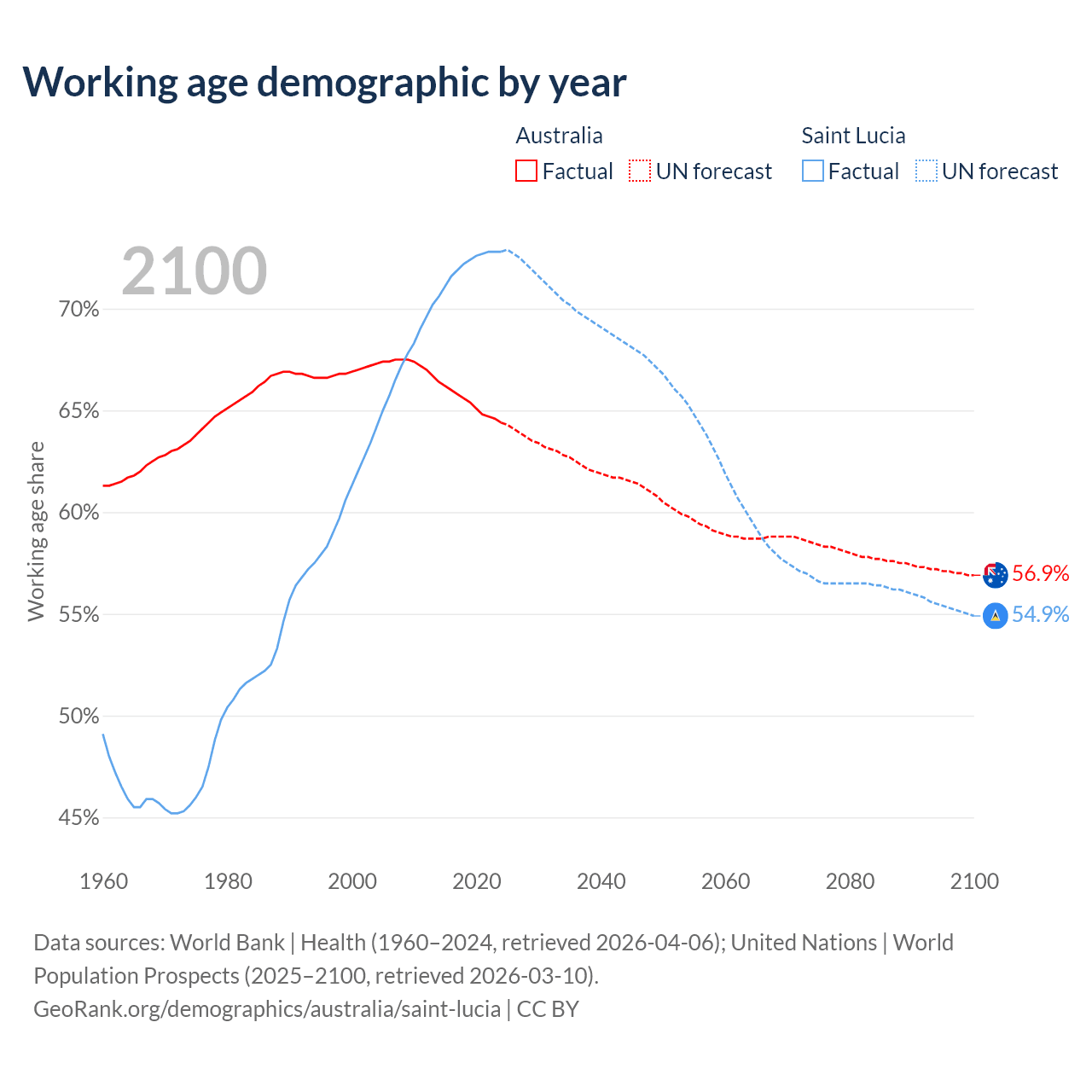 - Australia has 17.9M working age adults (aged 15-64) vs 132K in Saint Lucia.
