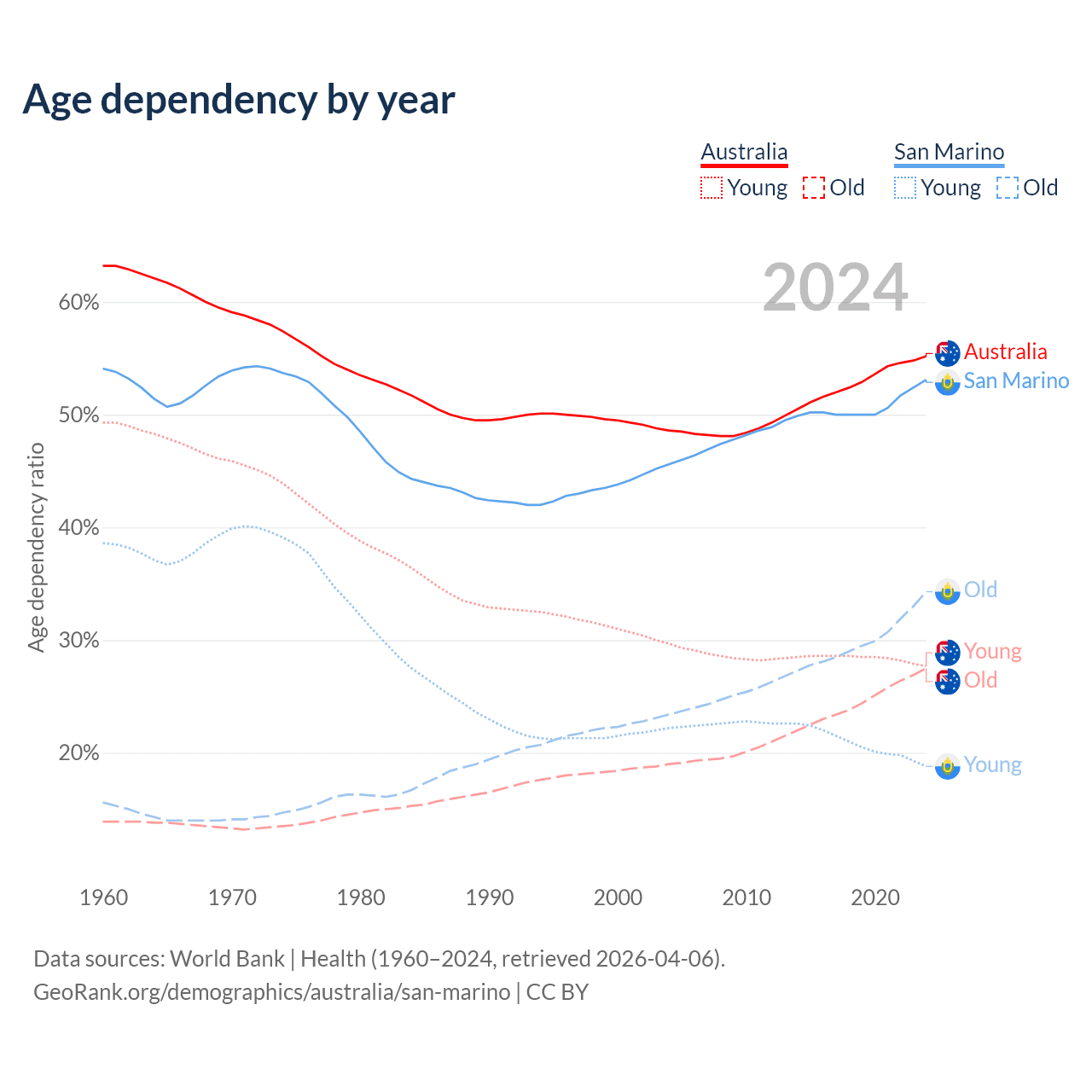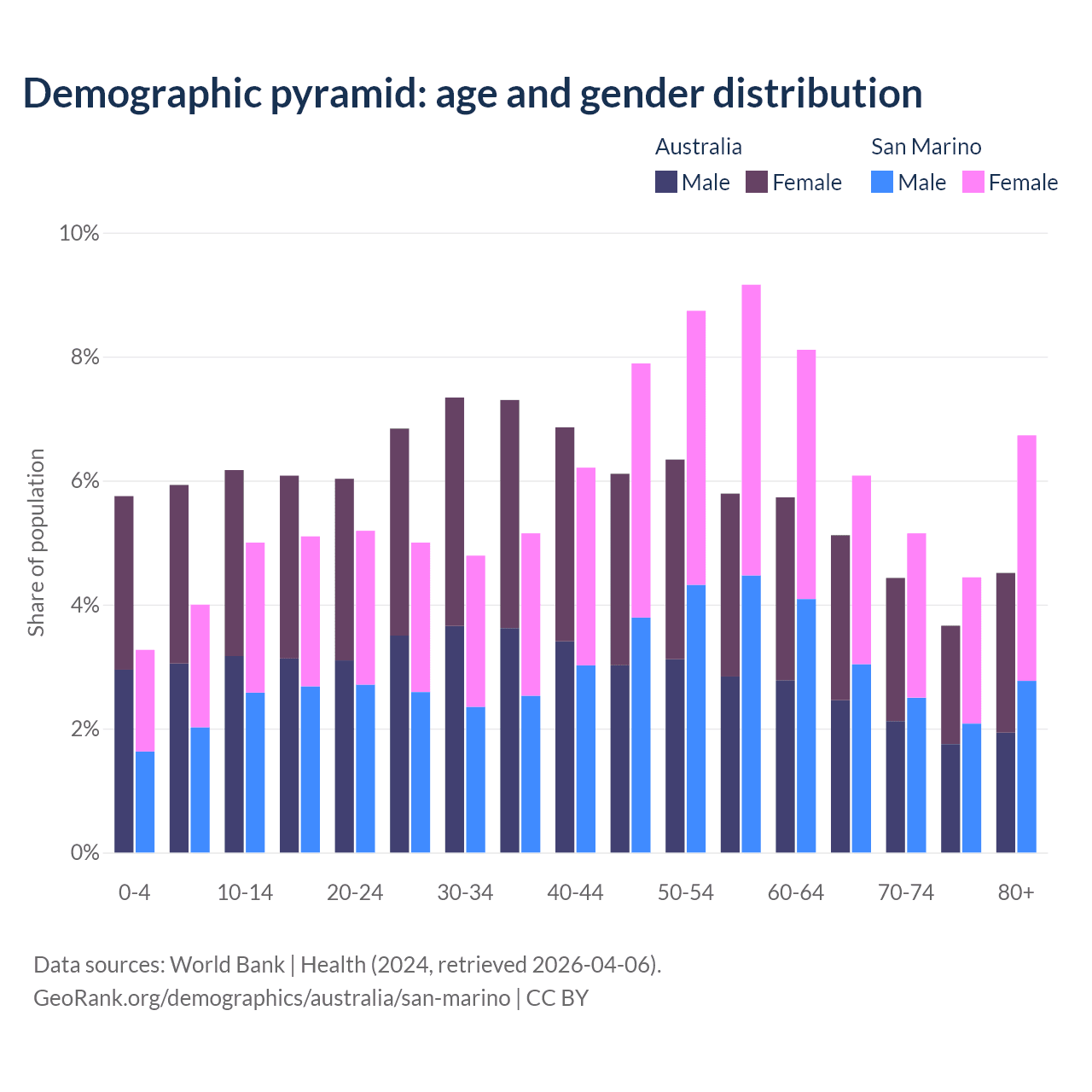 - Australia is ranked 55/196 by median age (oldest to youngest) vs 3/196 for San Marino.