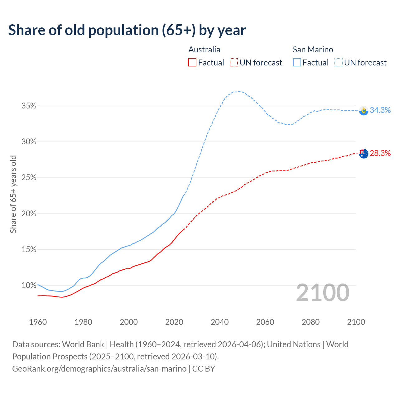- The share of old-age demographic (65+) in Australia is 17.7% vs 22.4% in San Marino.