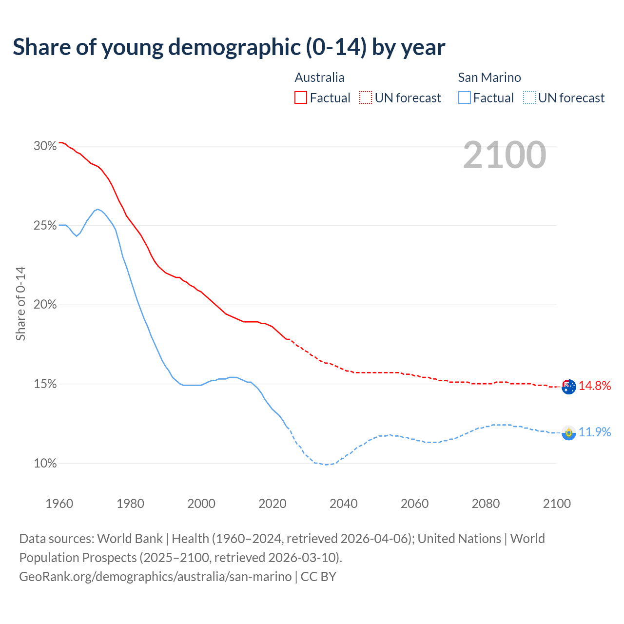 - The share of young demographic (0-15 years old) in Australia is 17.8% vs 12.3% in San Marino.