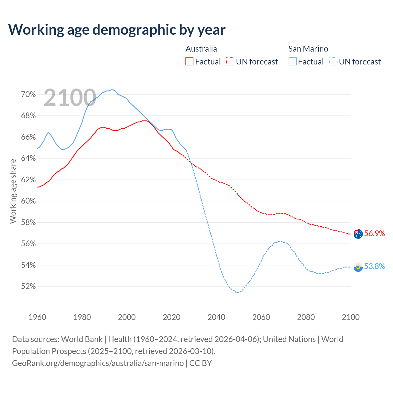 - Australia has 17.9M working age adults (aged 15-64) vs 22.2K in San Marino.