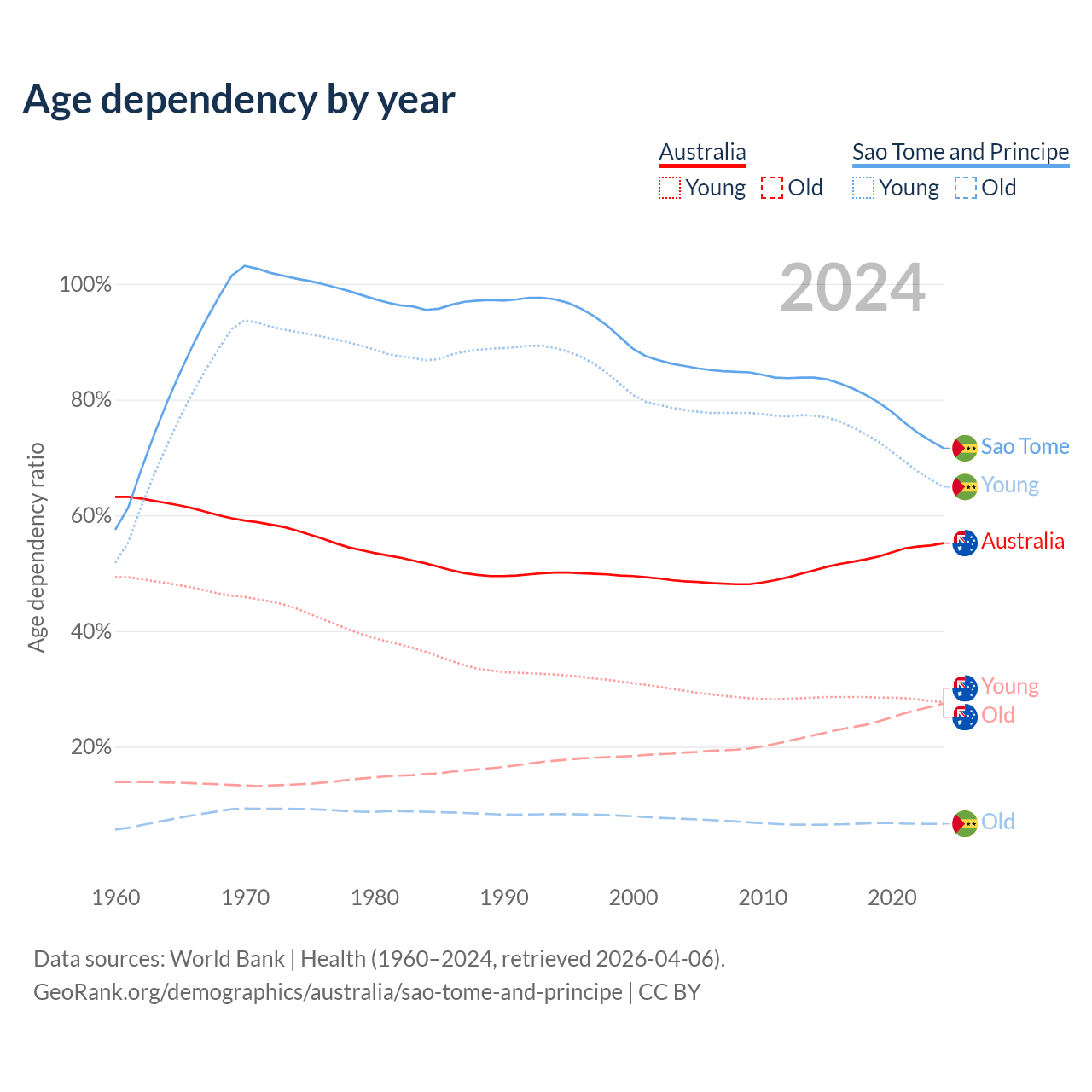- Australia is ranked 55/196 by median age (oldest to youngest) vs 163/196 for Sao Tome and Principe.