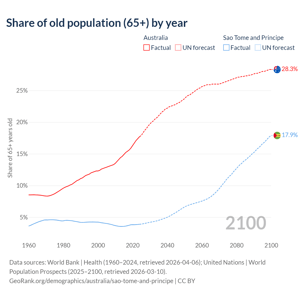 The share of older people aged 65 and over is 17.7% in Australia and 3.9% in Sao Tome and Principe. Life expectancy in Australia compared to Sao Tome and Principe .
