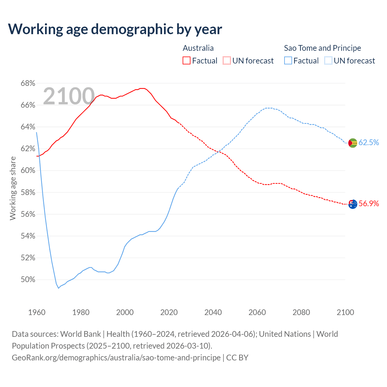 - The share of young demographic (0-15 years old) in Australia is 17.8% vs 37.8% in Sao Tome and Principe.