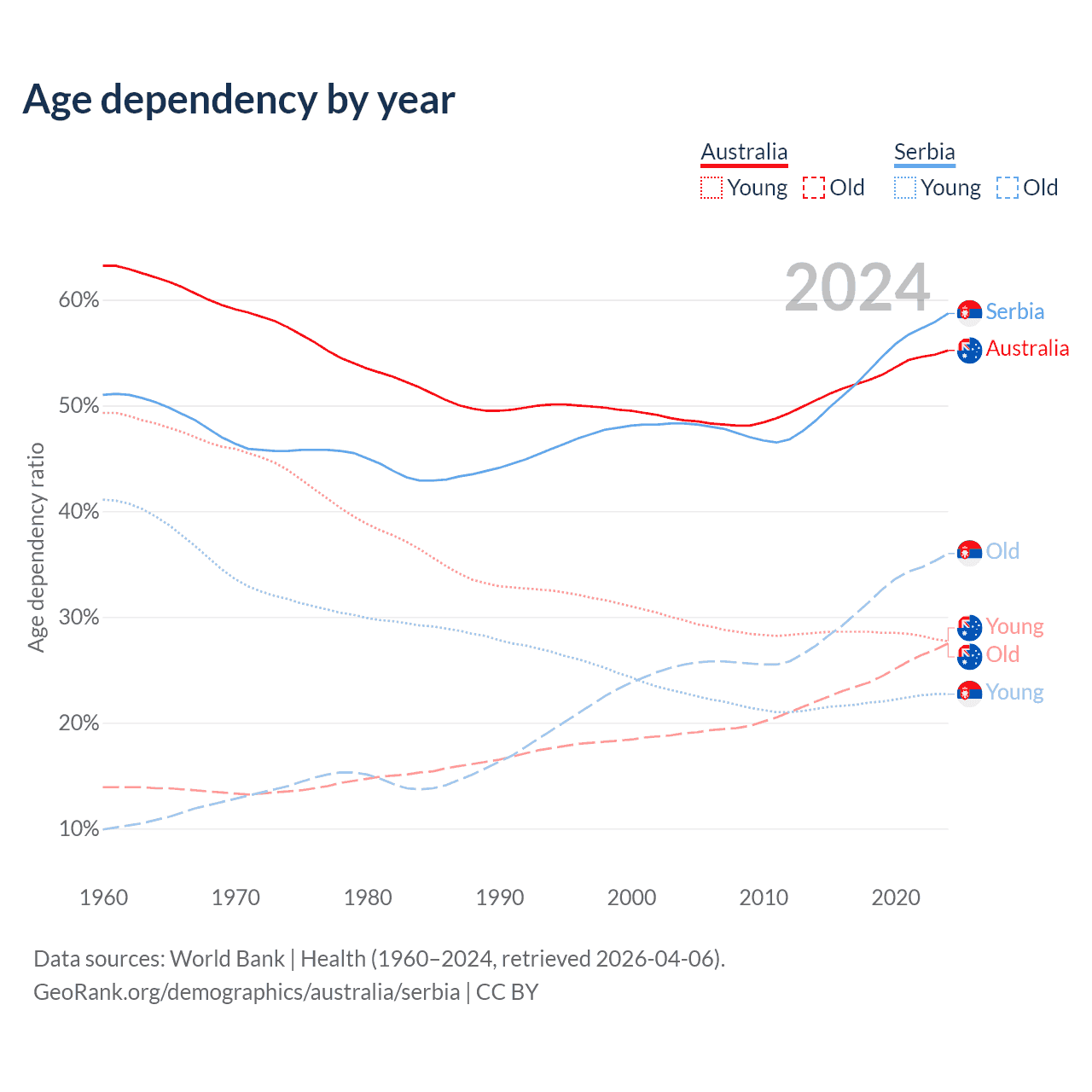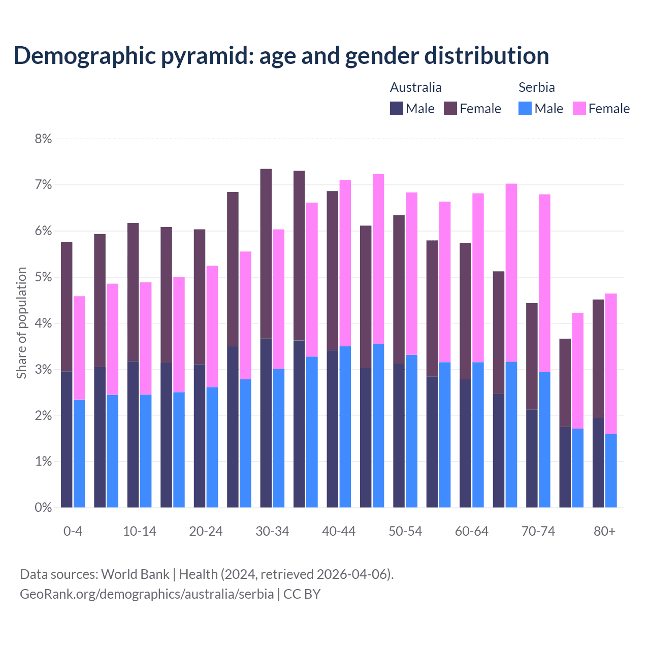 - Australia is ranked 55/196 by median age (oldest to youngest) vs 15/196 for Serbia.