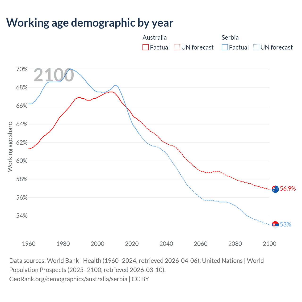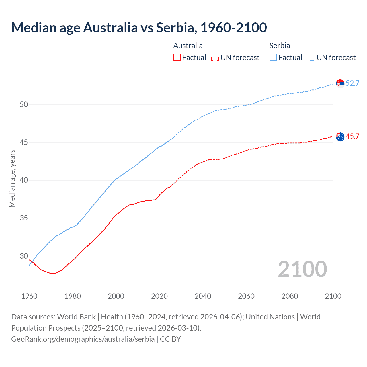 Median age Australia vs Serbia, 1960-2100