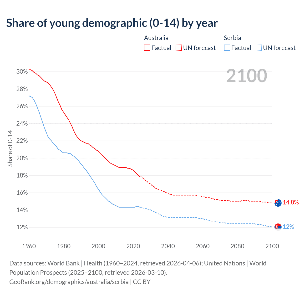 - The share of young demographic (0-15 years old) in Australia is 17.8% vs 14.3% in Serbia.