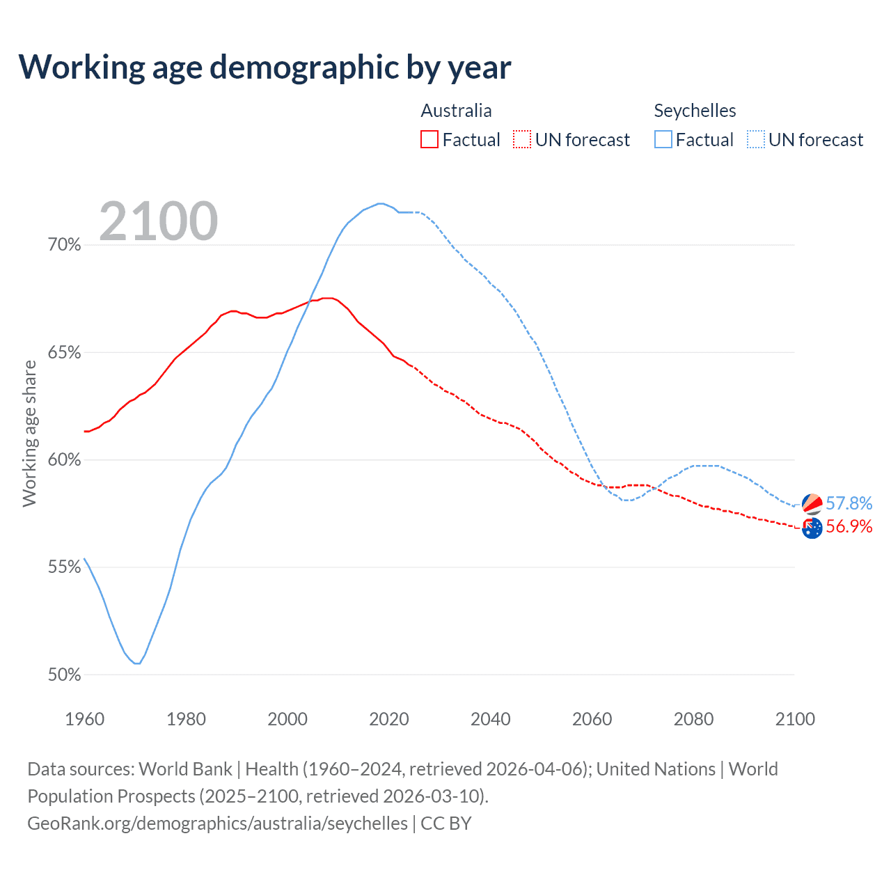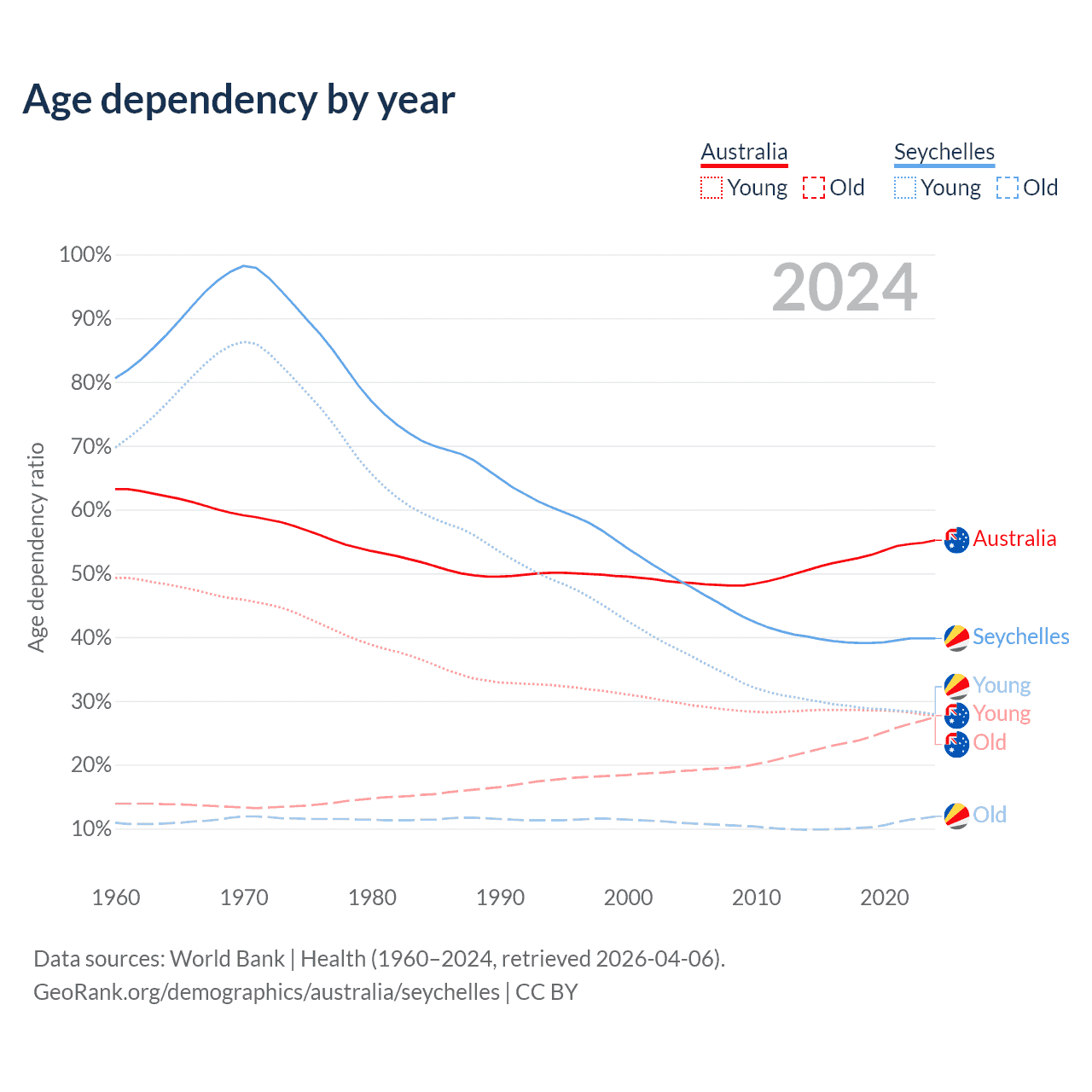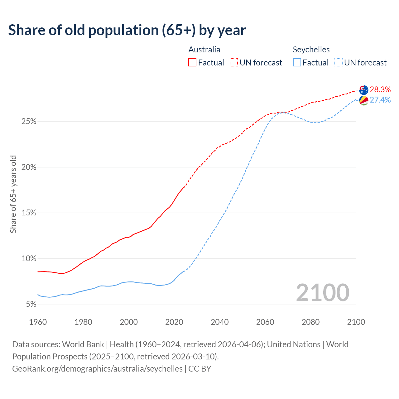 - The share of old-age demographic (65+) in Australia is 17.7% vs 8.54% in the Seychelles.