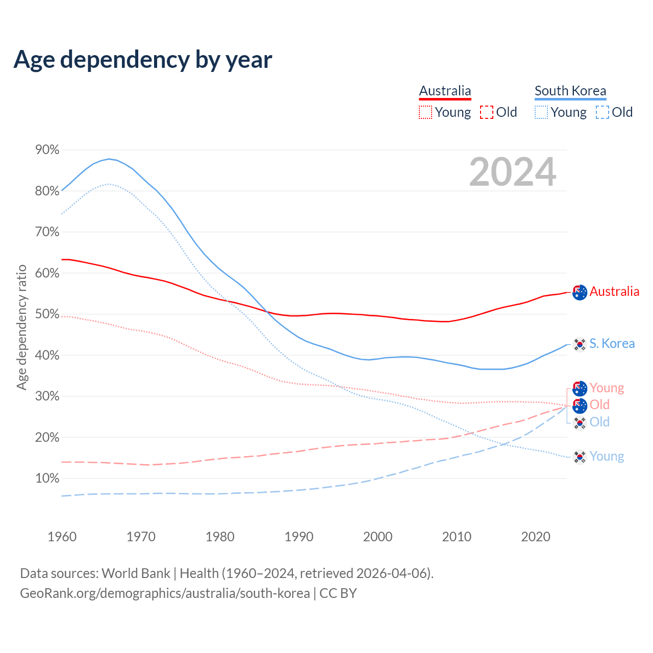 - Australia is ranked 55/196 by median age (oldest to youngest) vs 10/196 for South Korea.