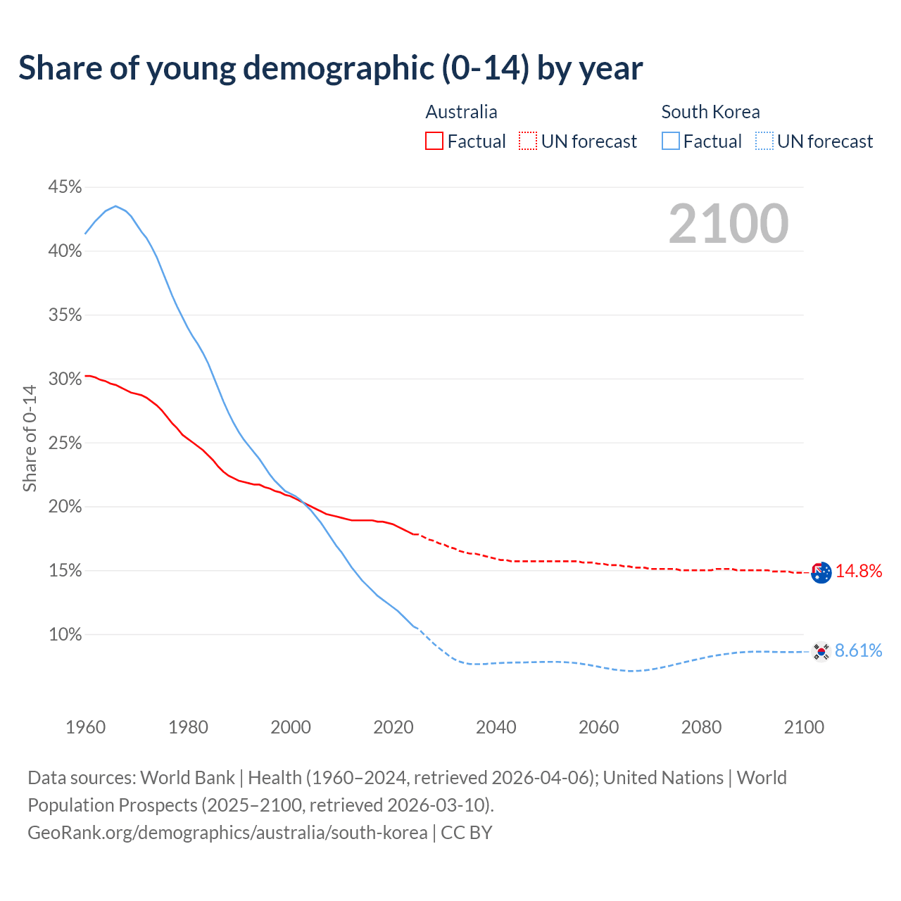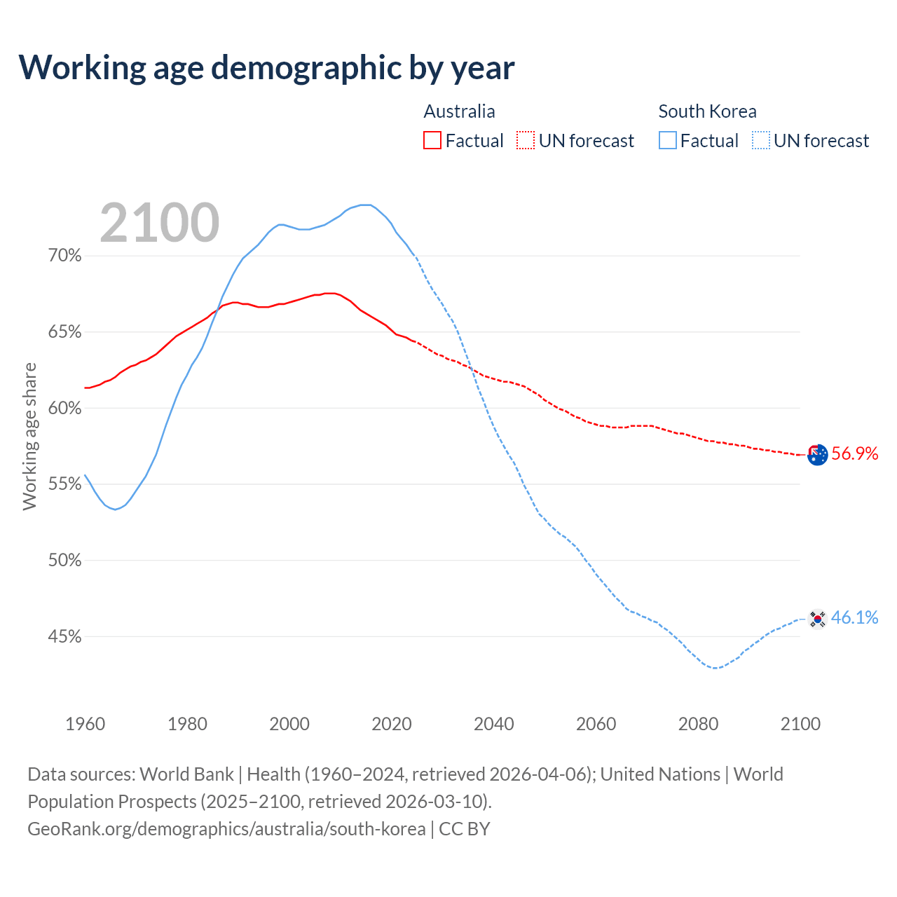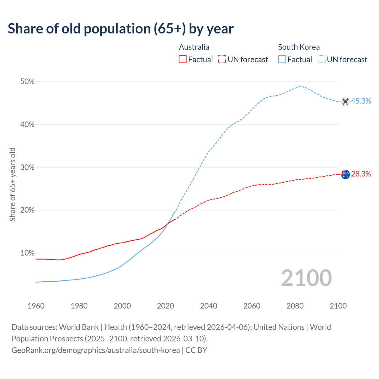 Median age Australia vs South Korea, 1960-2100