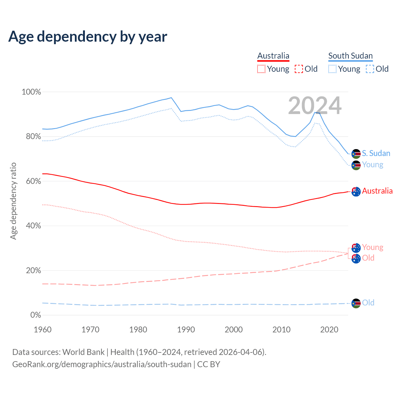 - Australia is ranked 55/196 by median age (oldest to youngest) vs 173/196 for South Sudan.