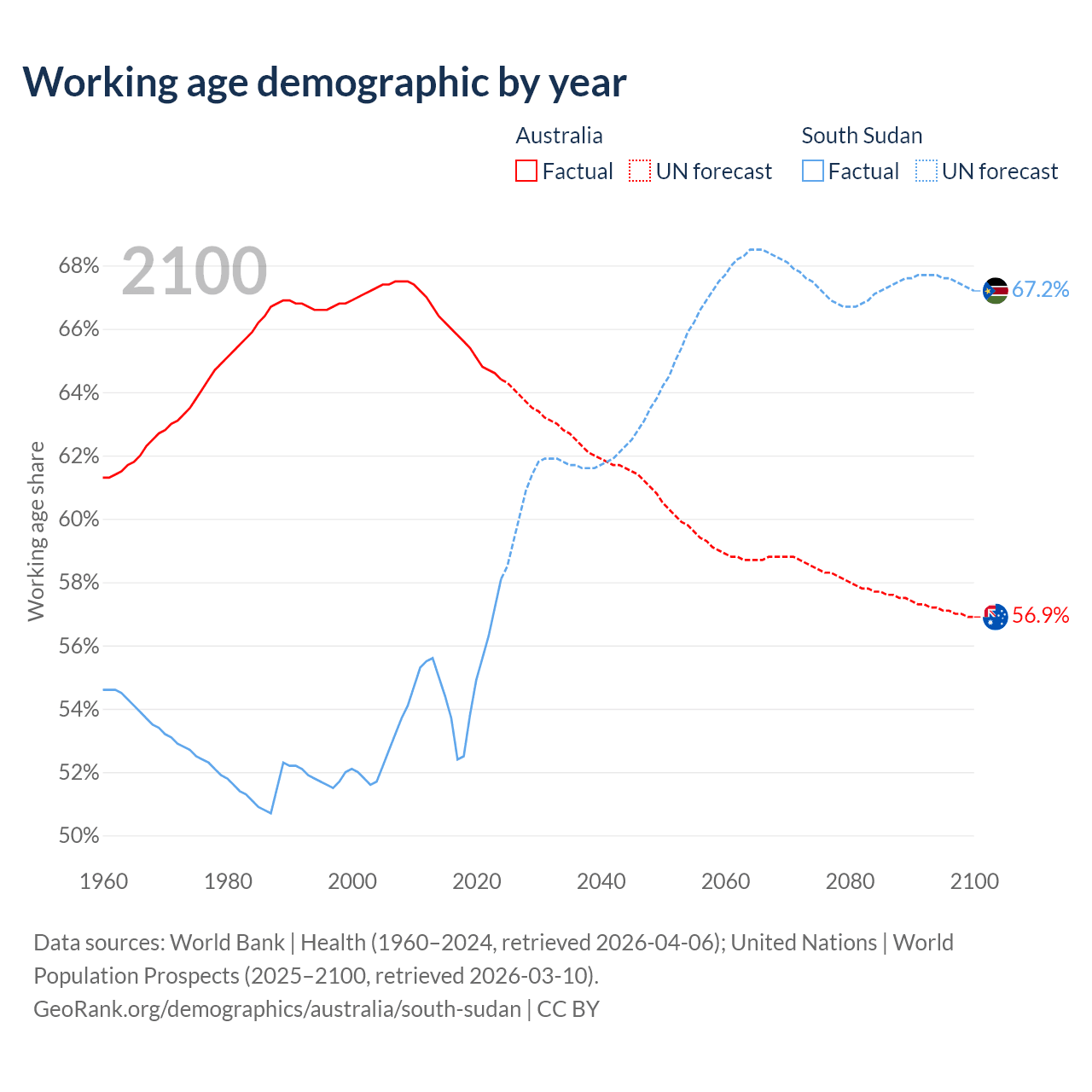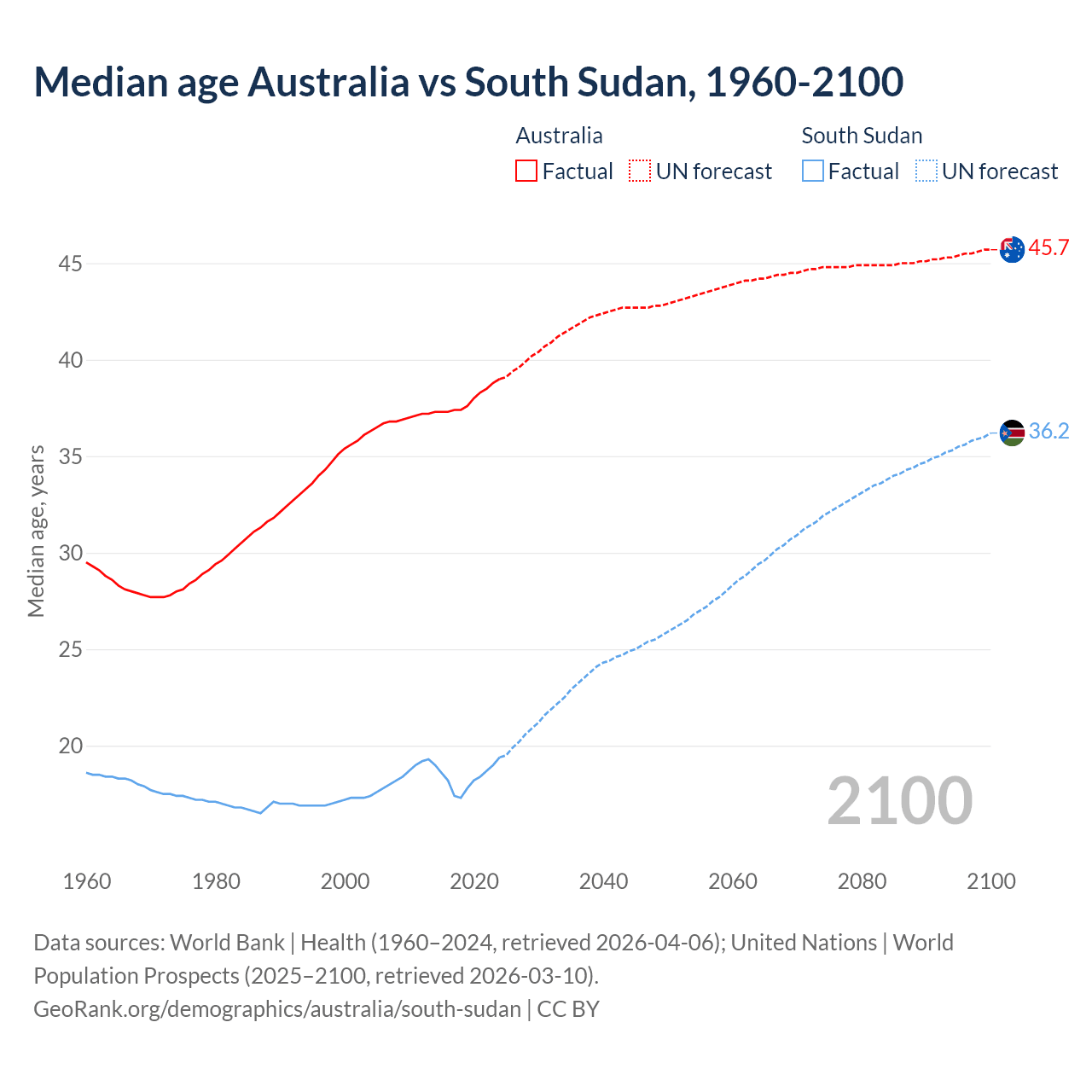 Median age Australia vs South Sudan, 1960-2100