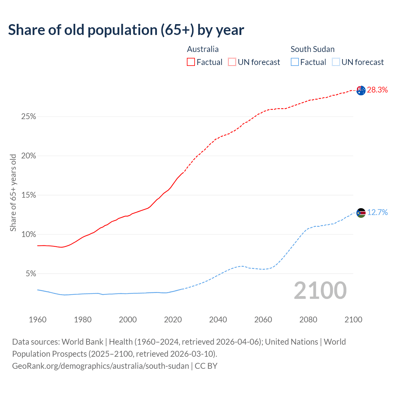 The share of older people aged 65 and over is 17.7% in Australia and 2.99% in South Sudan. Life expectancy in Australia compared to South Sudan .