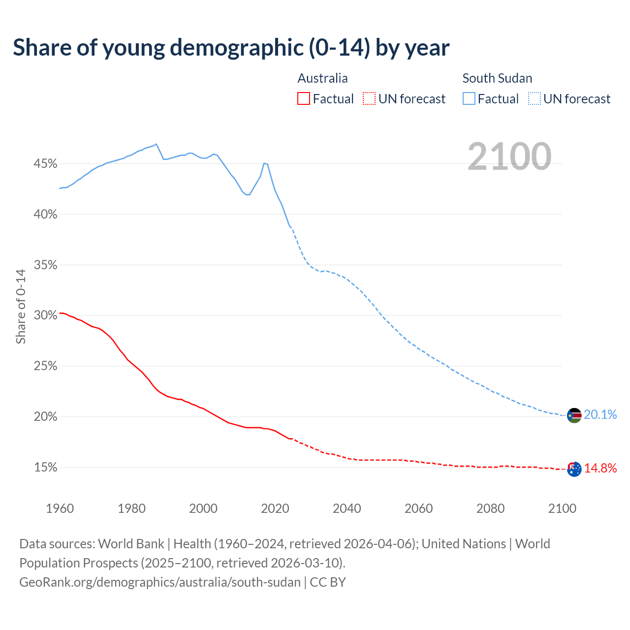 - The share of young demographic (0-15 years old) in Australia is 17.8% vs 38.9% in South Sudan.
