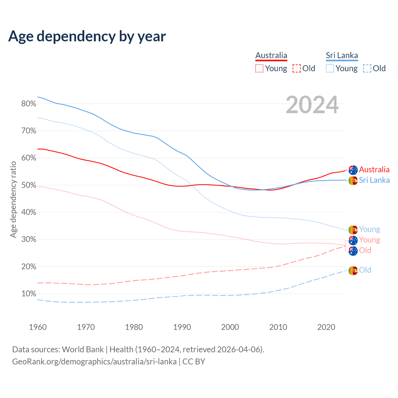- The share of old-age demographic (65+) in Australia is 17.7% vs 12.1% in Sri Lanka.