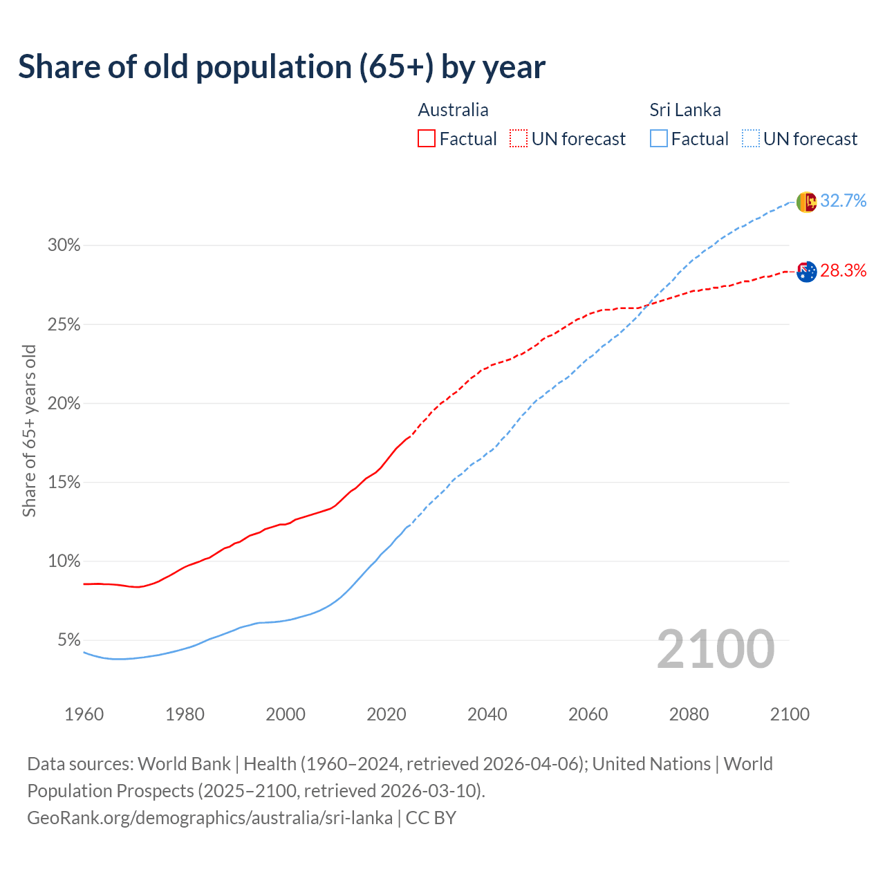 The share of older people aged 65 and over is 17.7% in Australia and 12.1% in Sri Lanka. Life expectancy in Australia compared to Sri Lanka .