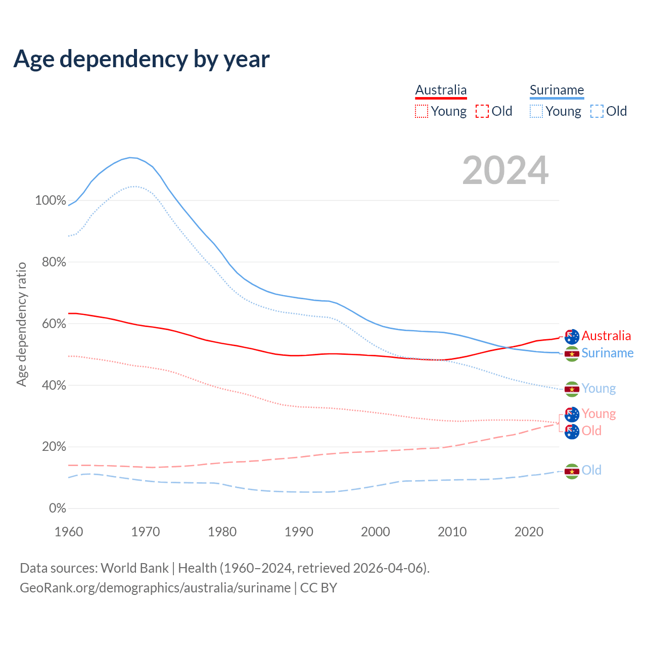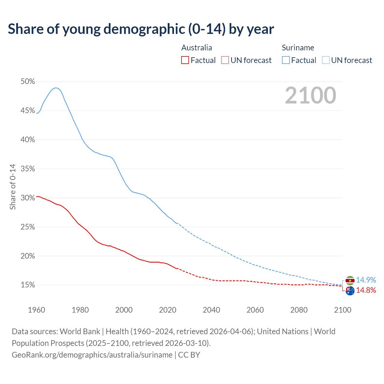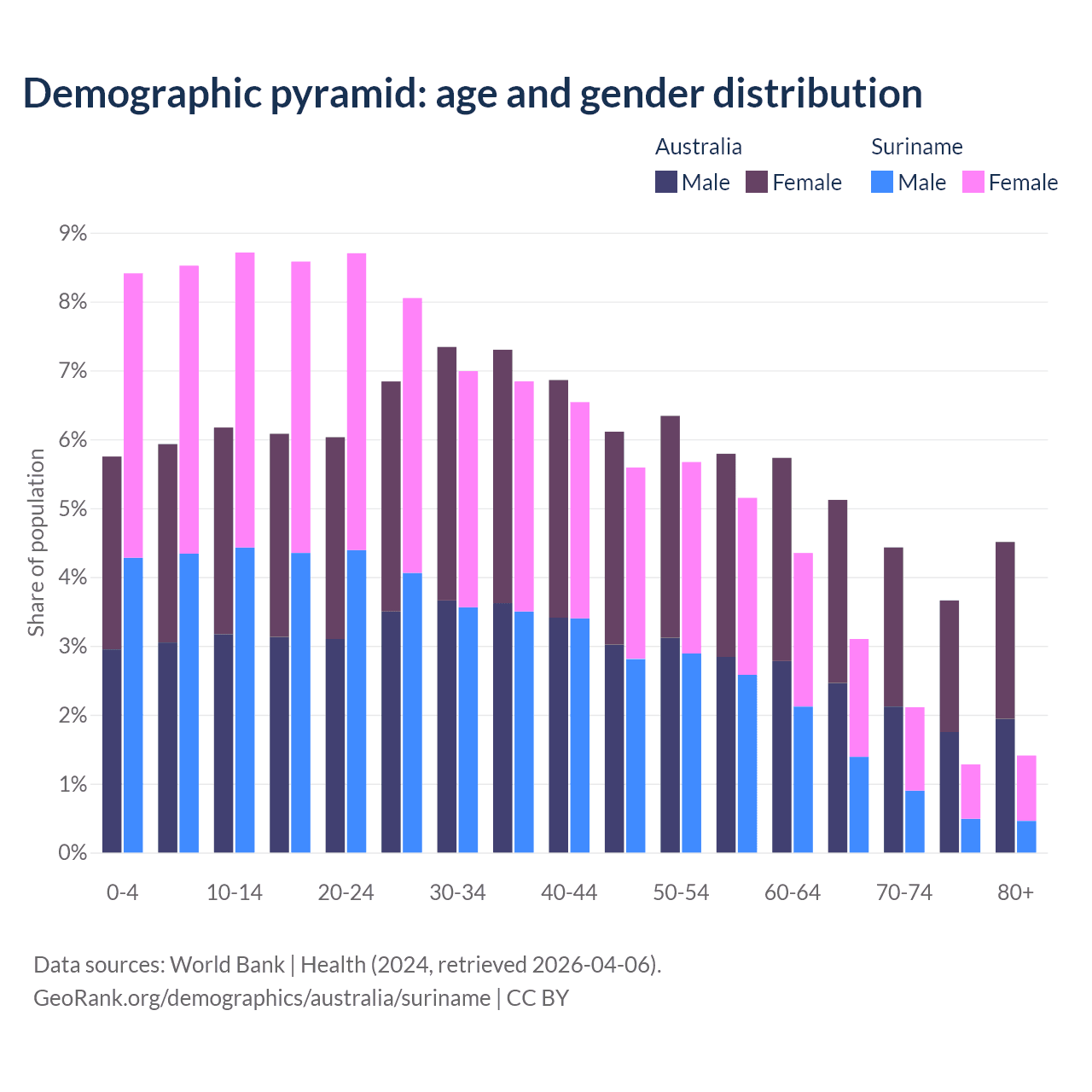- The share of young demographic (0-15 years old) in Australia is 17.8% vs 25.6% in Suriname.