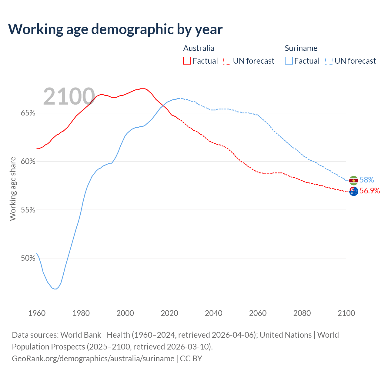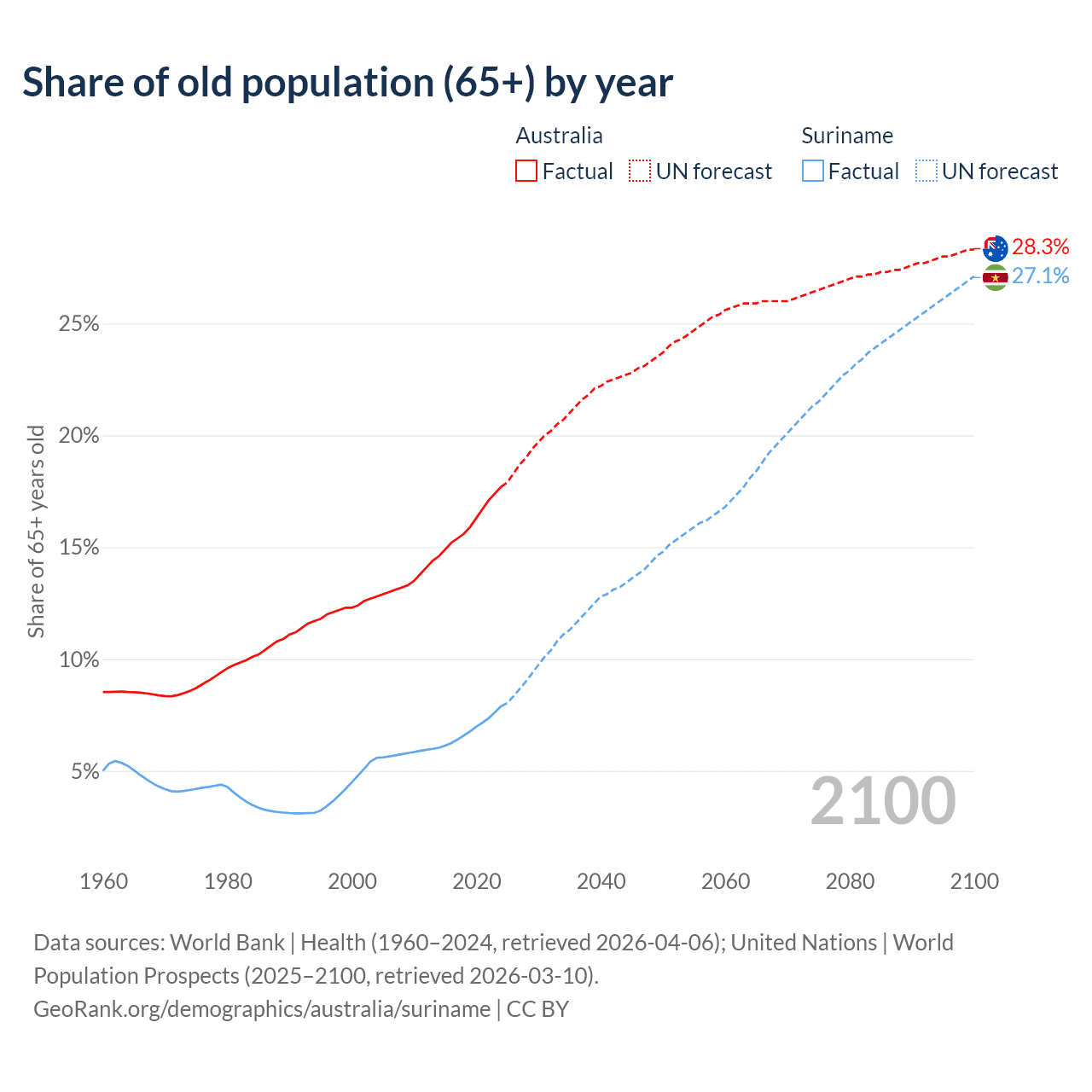 Median age Australia vs Suriname, 1960-2100