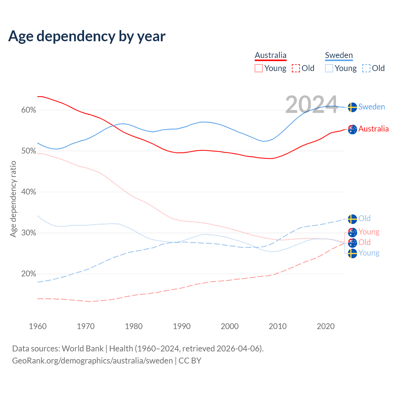 - Australia is ranked 55/196 by median age (oldest to youngest) vs 39/196 for Sweden.